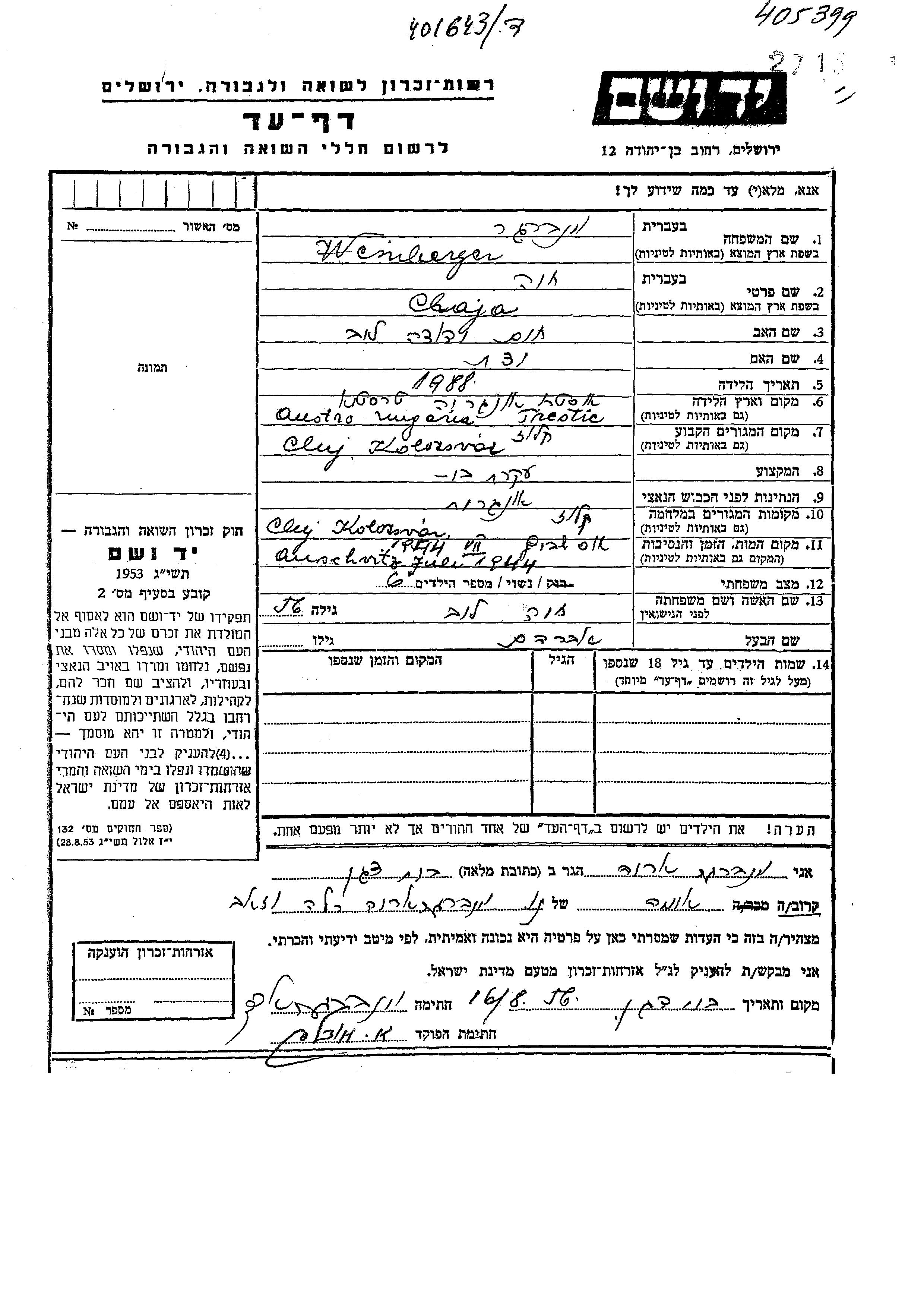 Chaja Weinberger Veinberg, geb. Lob wurde im Jahr 1888 in Trestie, Rumänien geboren. Sie war die Tochter von Khaim Yehuda und Yedit. Sie war Hausfrau und mit Avraham Verheiratet. Vor dem Zweiten Weltkrieg lebte sie in Cluj, Rumänien. Während des Krieges war sie in Cluj, Rumänien.