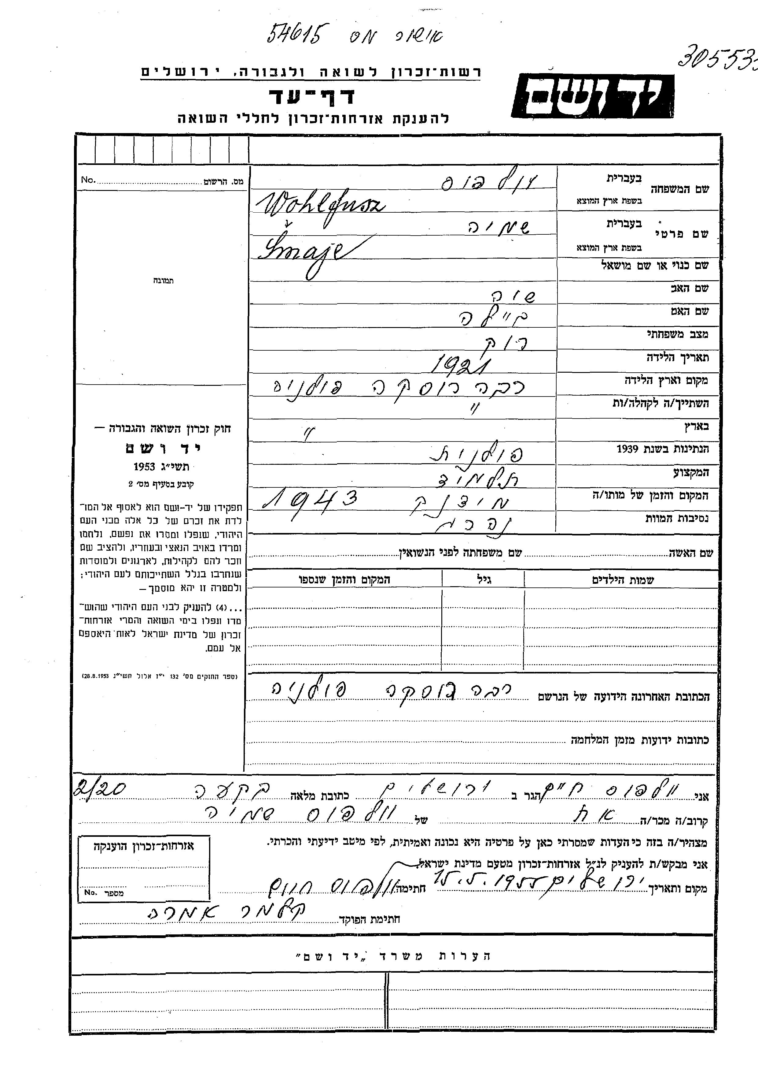 Smaje Wohlfusz wurde im Jahr 1921 in Rawa Ruska, Polen geboren. Er war der Sohn von Shaia und Beila. Er war Schüler/-in. Vor dem Zweiten Weltkrieg lebte er in Rawa Ruska, Polen. Während des Krieges war er in Rawa Ruska, Polen.