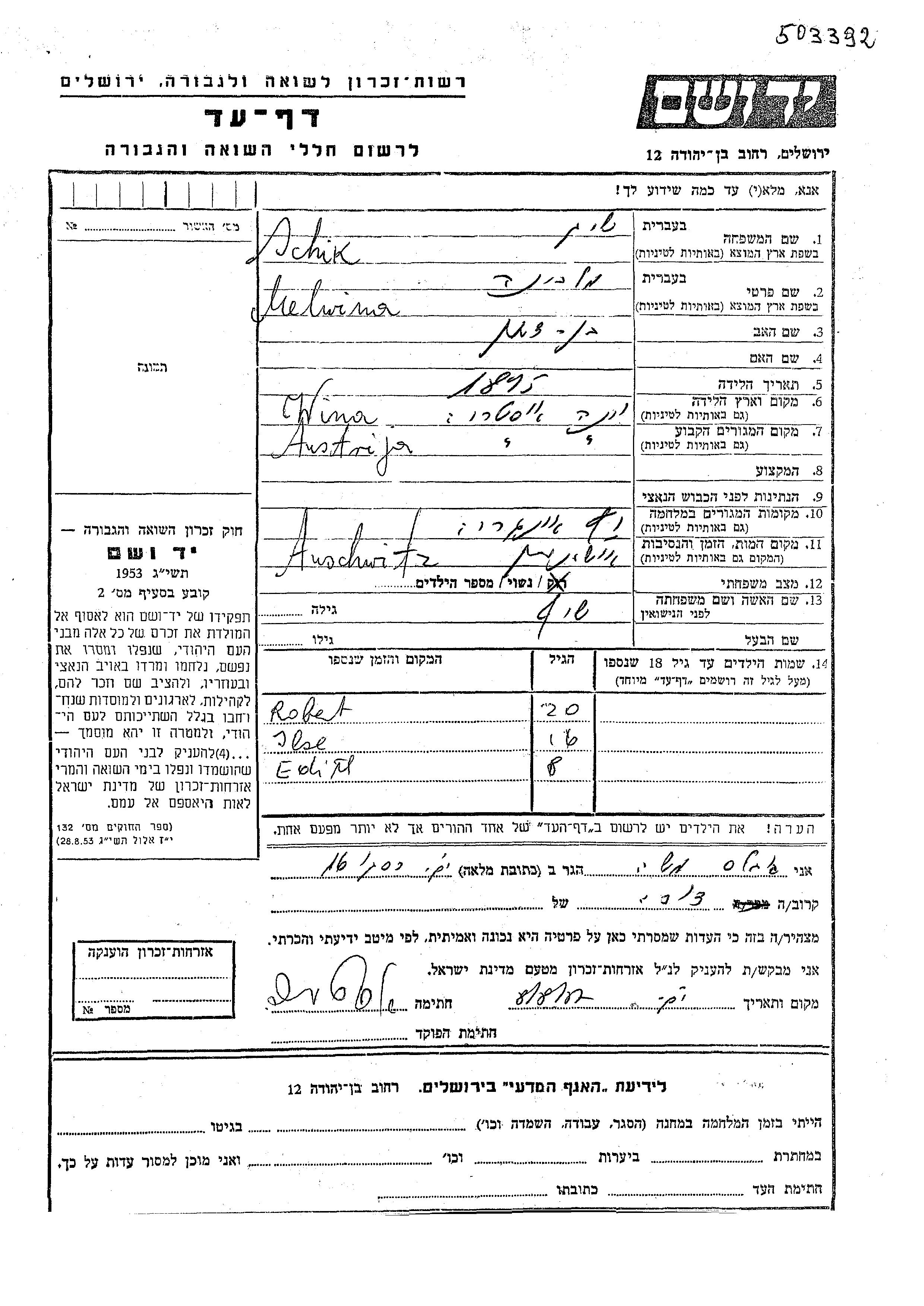 Edith Schik wurde Sie war die Tochter von Melwina, geb. Shif. Sie war Kind. Vor dem Zweiten Weltkrieg lebte sie in Vienna, Österreich. Während des Krieges war sie in Vac, Ungarn.