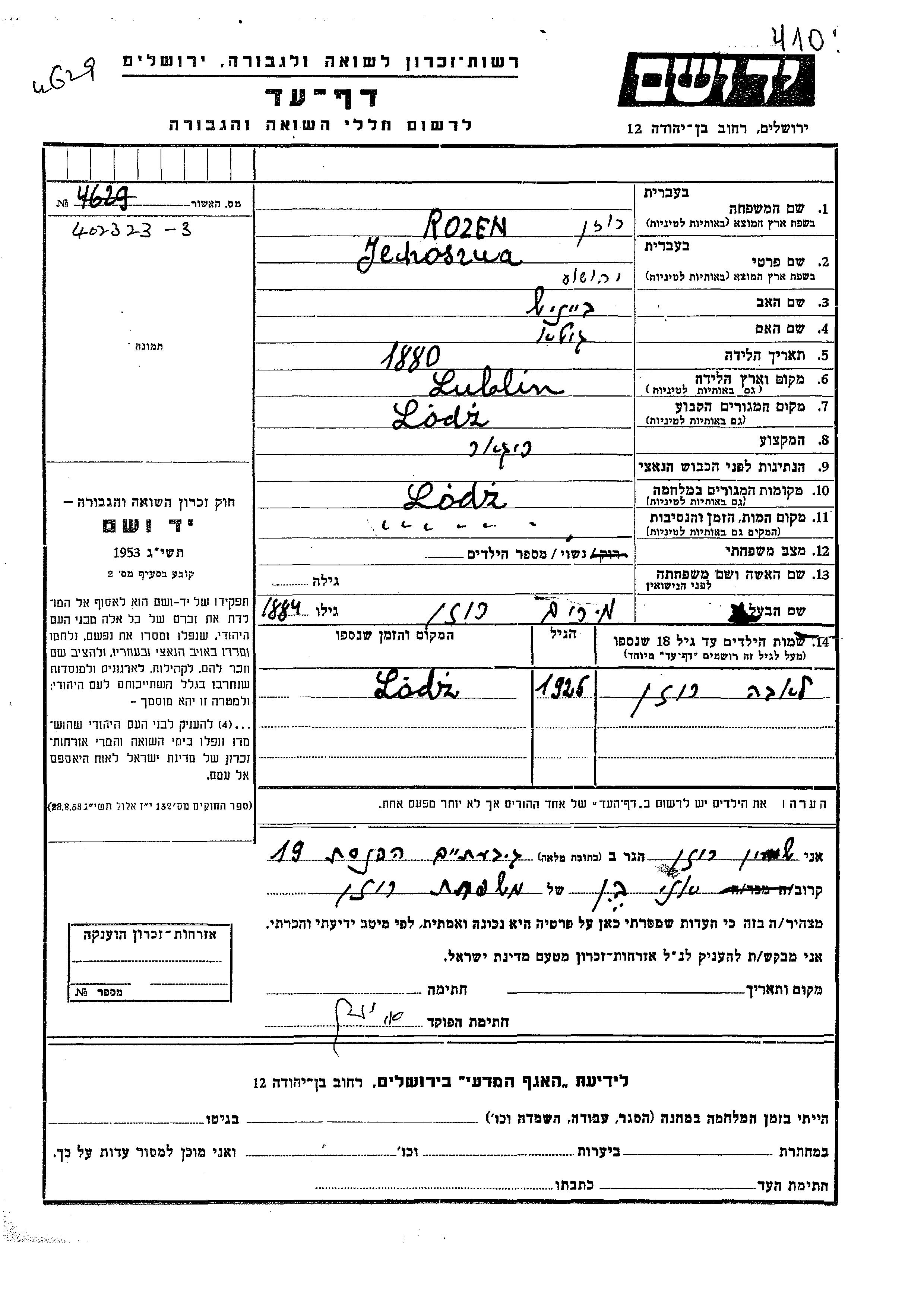 Leib Rozen wurde Er/sie war der/ die Sohn/Tochter von Jehoszua und Miriam. Er/Sie war Kind. Vor dem Zweiten Weltkrieg er/sie in Lodz, Polen. Während des Krieges war er/sie in Lodz, Polen.