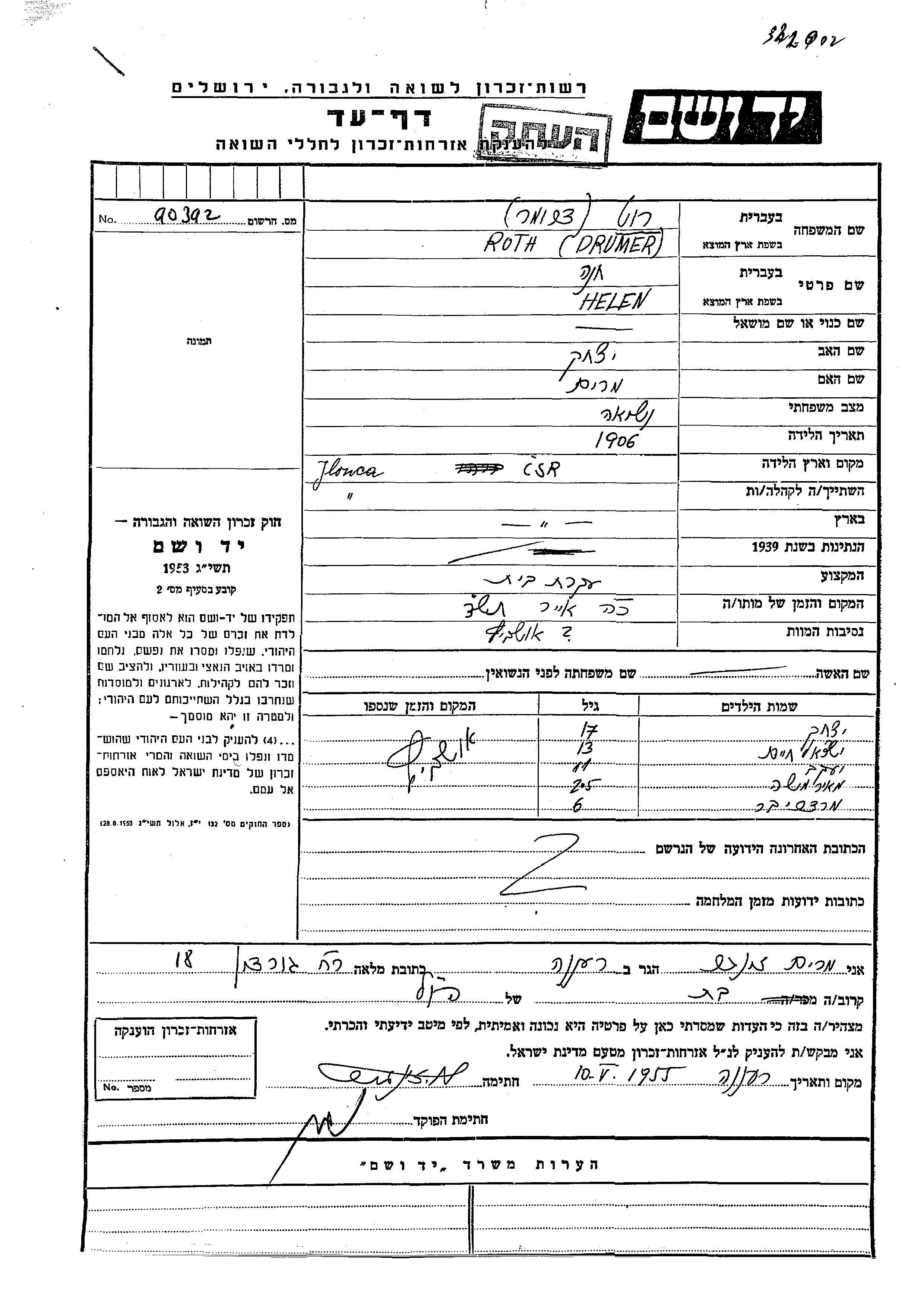 Roth Rut Dromer Mordekhai Ber Ilonca, Tschechoslowakei Gedenkblatt