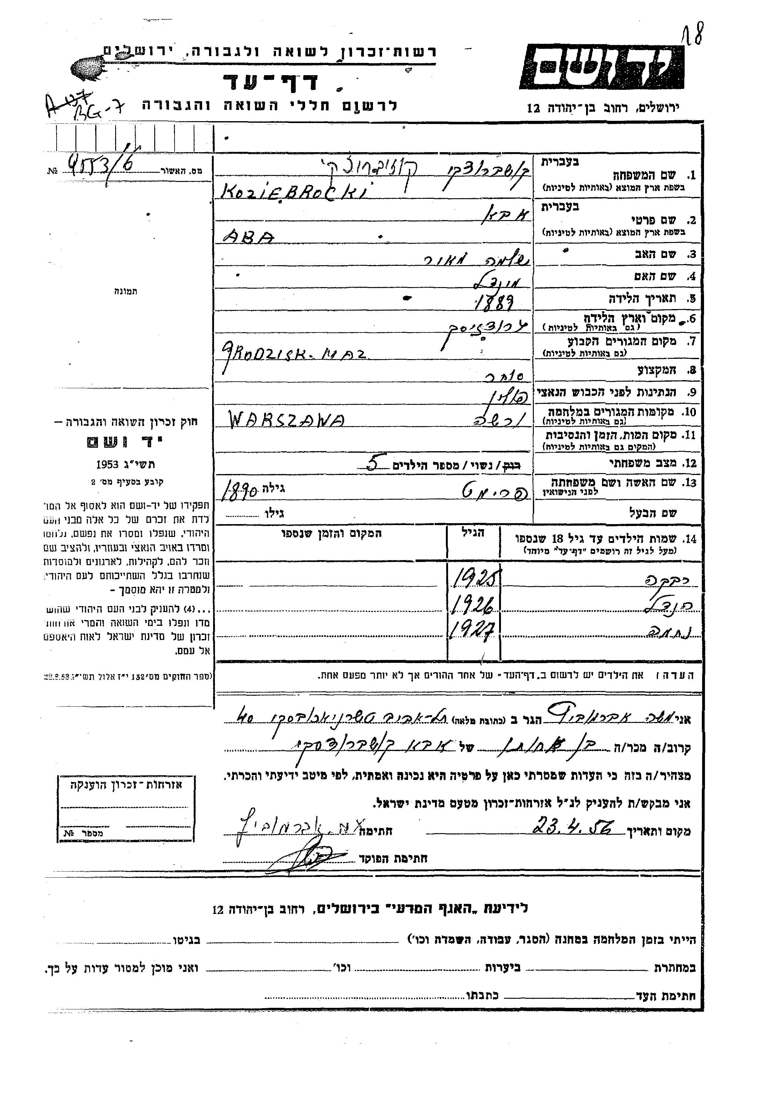 Rivka Koziebrocki wurde im Jahr 1925 geboren. Sie war die Tochter von Aba und Frimet. Sie war Kind. Vor dem Zweiten Weltkrieg lebte sie in Grodzisk Mazowiecki, Polen. Während des Krieges war sie in Warsaw, Polen.