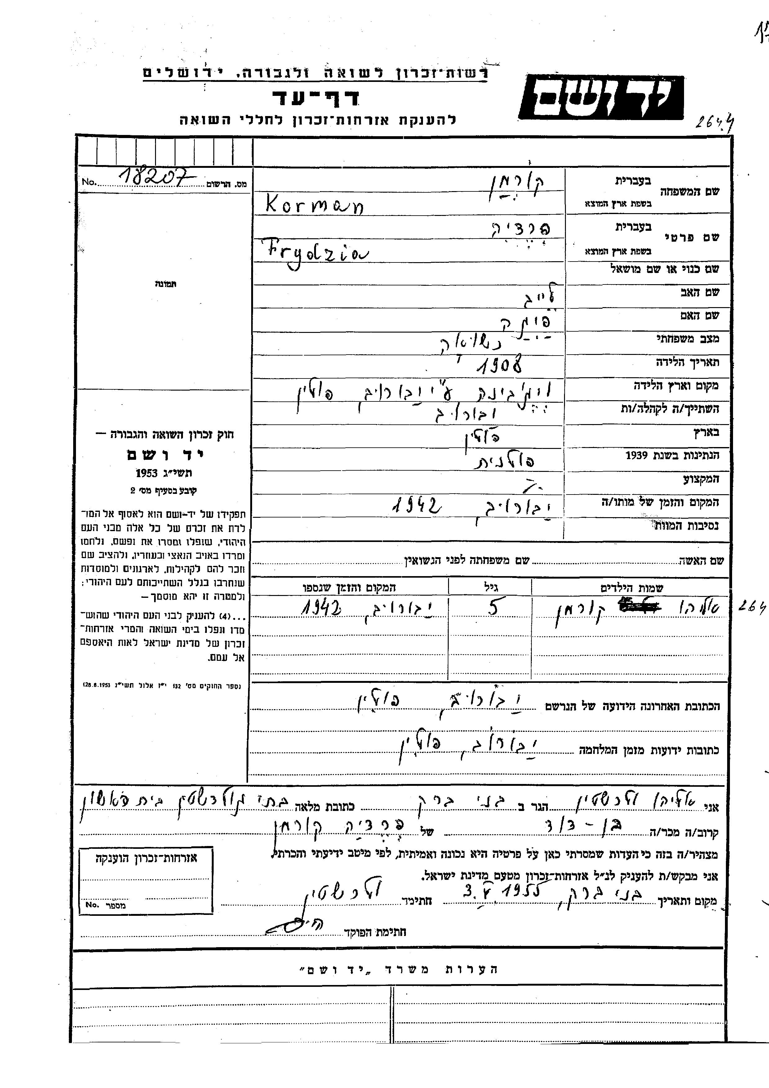 Eliahu Korman wurde Er war der Sohn von Frydzia Fradia. Er war Kind. Vor dem Zweiten Weltkrieg lebte er in Jaworow, Polen. Während des Krieges war er in Jaworow, Polen.