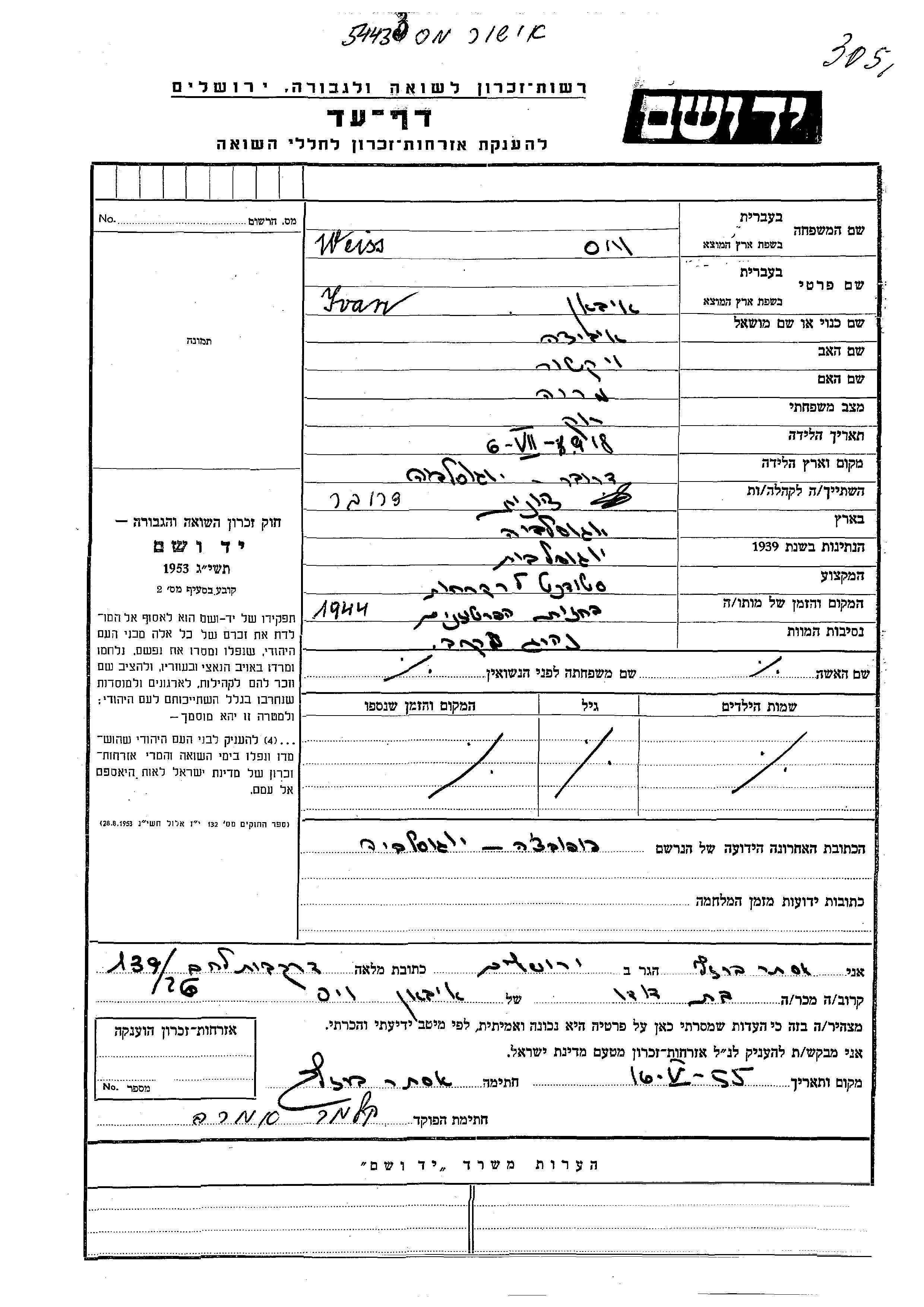 Ivan Weiss wurde im Jahr 1918 in Daruvar, Jugoslawien geboren. Er war der Sohn von Viktor und Maria. Er war Student und Ledig. Vor dem Zweiten Weltkrieg lebte er in Daruvar, Jugoslawien. Während des Krieges war er in Jugoslawien.