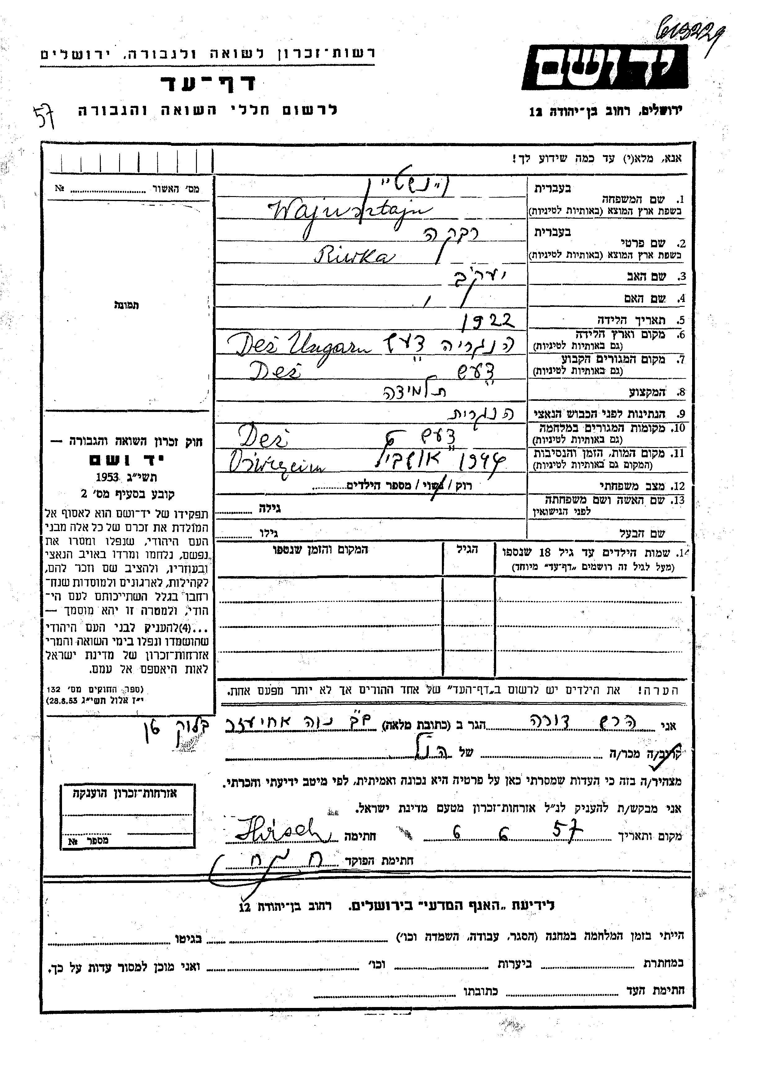 Riwka Wajnstajn wurde im Jahr 1922 in Des, Rumänien geboren. Sie war die Tochter von Yaakov. Sie war Schüler/-in und Ledig. Vor dem Zweiten Weltkrieg lebte sie in Des, Rumänien. Während des Krieges war sie in Des, Rumänien.
