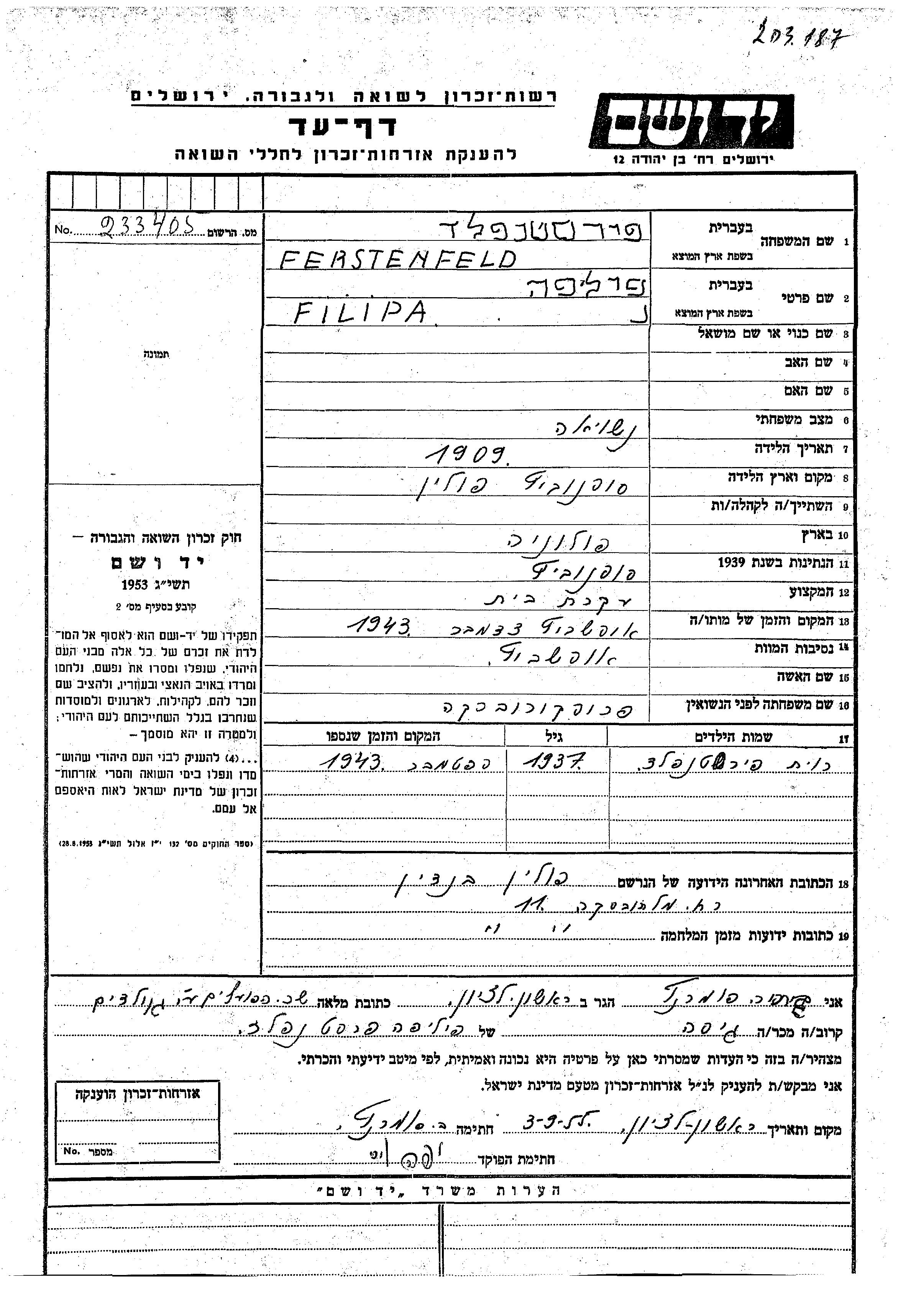Rut Ferstenfeld wurde im Jahr 1937 geboren. Sie war die Tochter von Filipa, geb. Proskurovska. Sie war Kind. Vor dem Zweiten Weltkrieg lebte sie in Bendin, Polen. Während des Krieges war sie in Bendin, Polen.