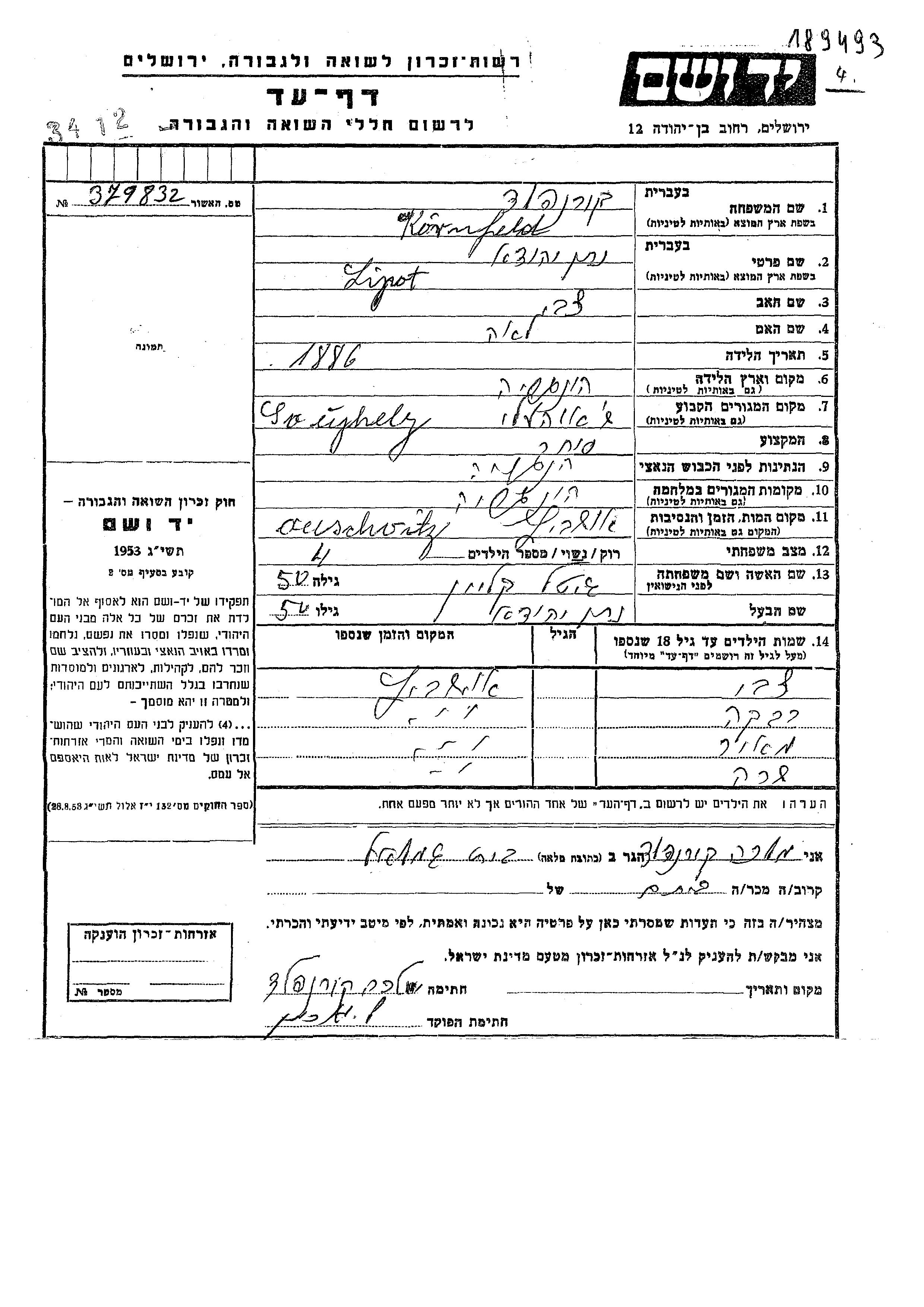 Sara Kornfeld wurde Sie war die Tochter von Natan Yehuda Lipot und Gitel, geb. Klein. Sie war Kind. Vor dem Zweiten Weltkrieg lebte sie in Satoraljaujhely, Ungarn. Während des Krieges war sie in Ungarn.