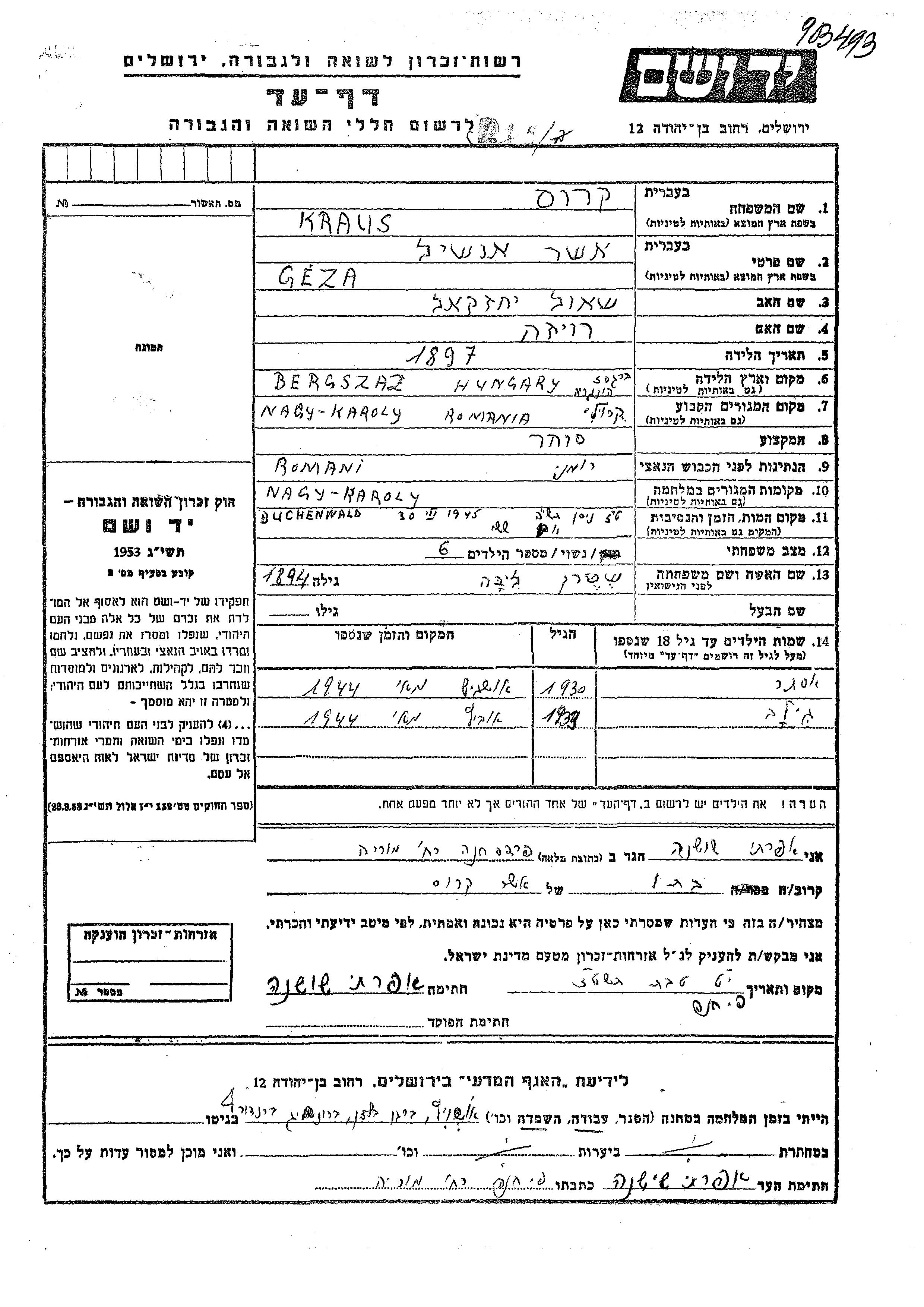 Gilberta Kraus Kros wurde im Jahr 1933 geboren. Er/sie war der/ die Sohn/Tochter von Asher Anshil Geza und Liba, geb. Shtern. Er/Sie war Kind. Vor dem Zweiten Weltkrieg er/sie in Nagy Karoly, Rumänien. Während des Krieges war er/sie in Nagy Karoly, Rumänien.