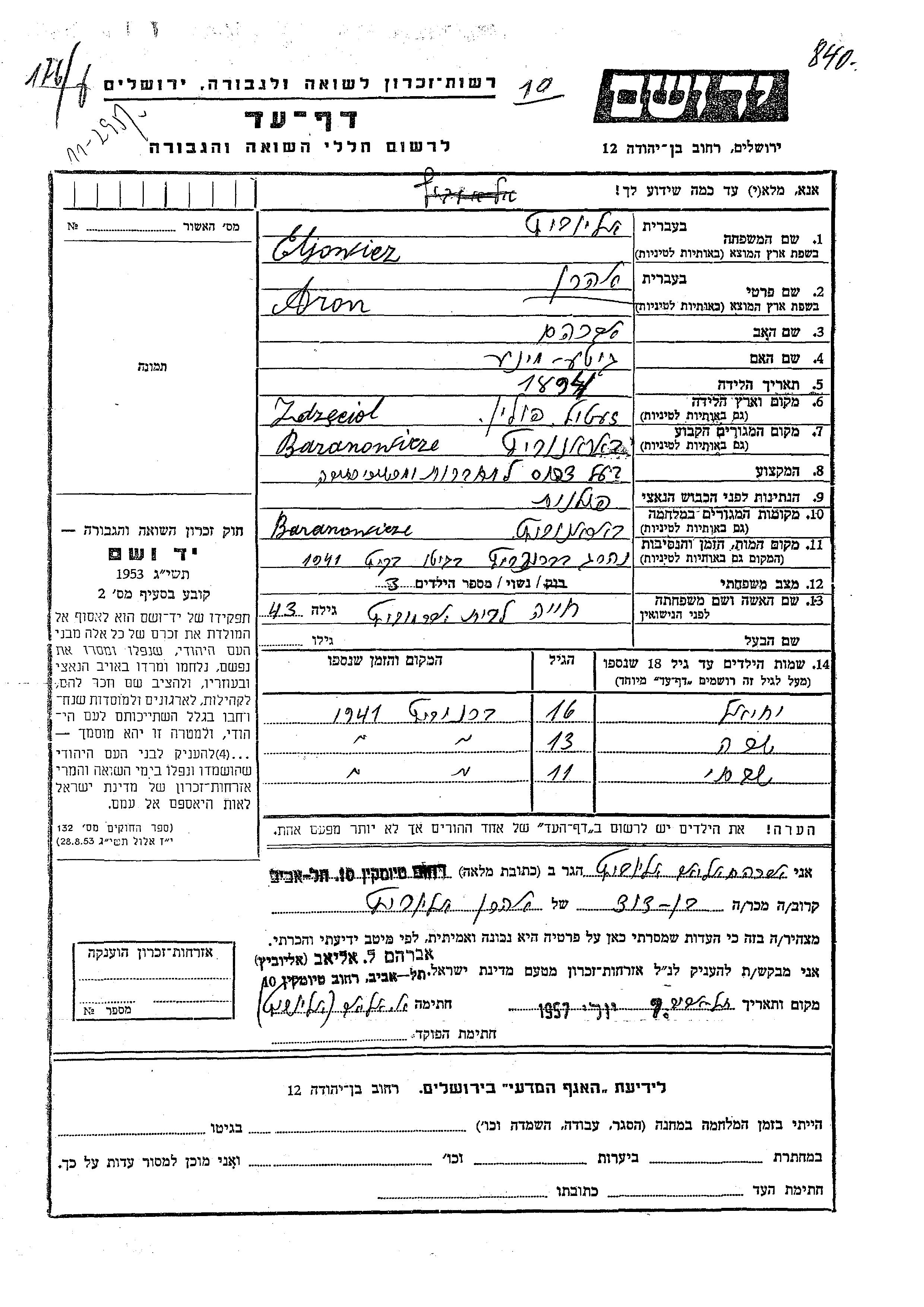 Yekhiel Eljowicz wurde Er war der Sohn von Aron und Khaia, geb. Abramovitz. Er war Kind. Vor dem Zweiten Weltkrieg lebte er in Baranovichi, Polen. Während des Krieges war er in Baranovichi, Polen.