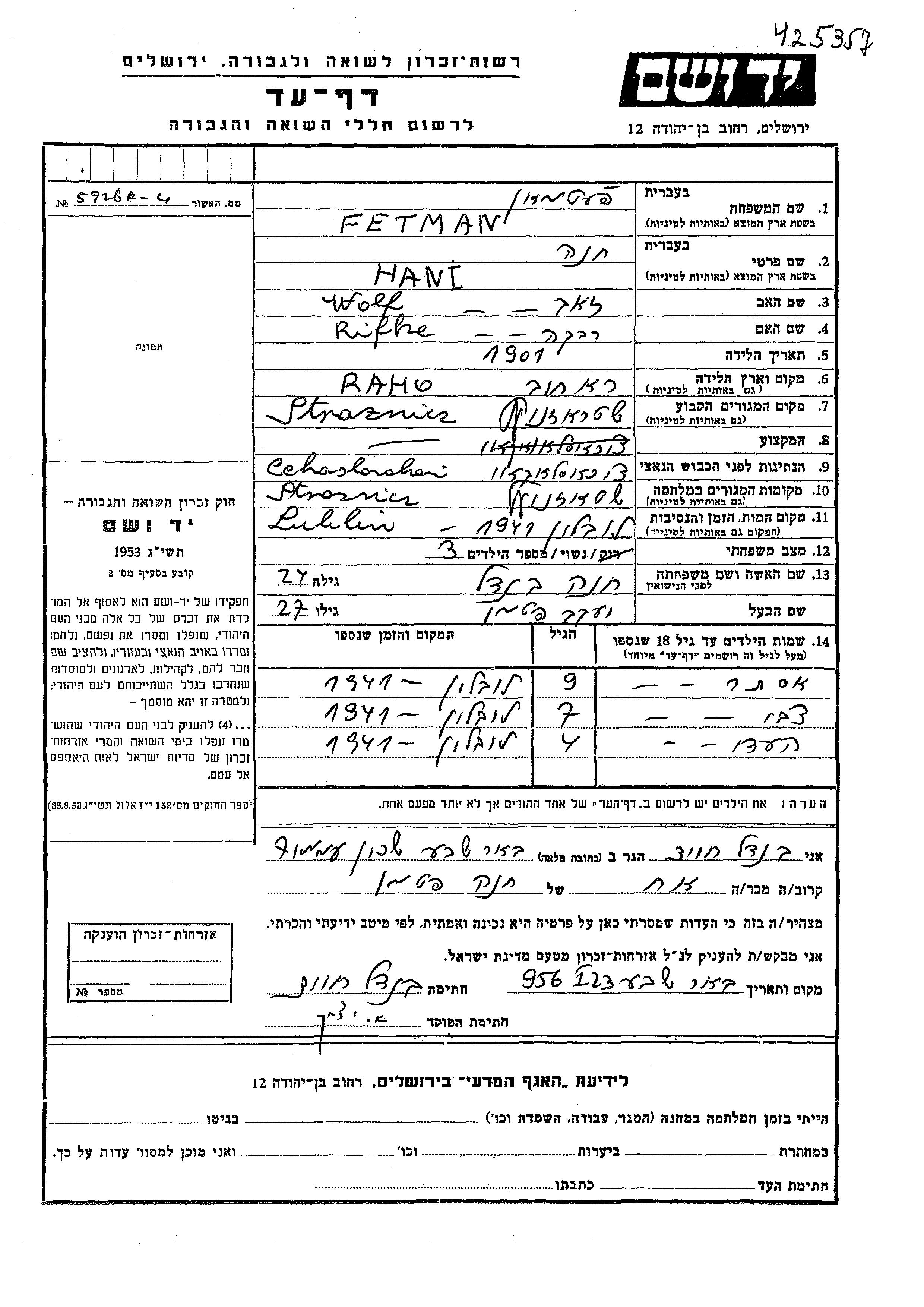 Tzvi Fetman wurde Er/sie war der/ die Sohn/Tochter von Khana und Hani, geb. Bendel. Er/Sie war Kind. Vor dem Zweiten Weltkrieg er/sie in Straznice, Tschechoslowakei. Während des Krieges war er/sie in Straznice, Tschechoslowakei.