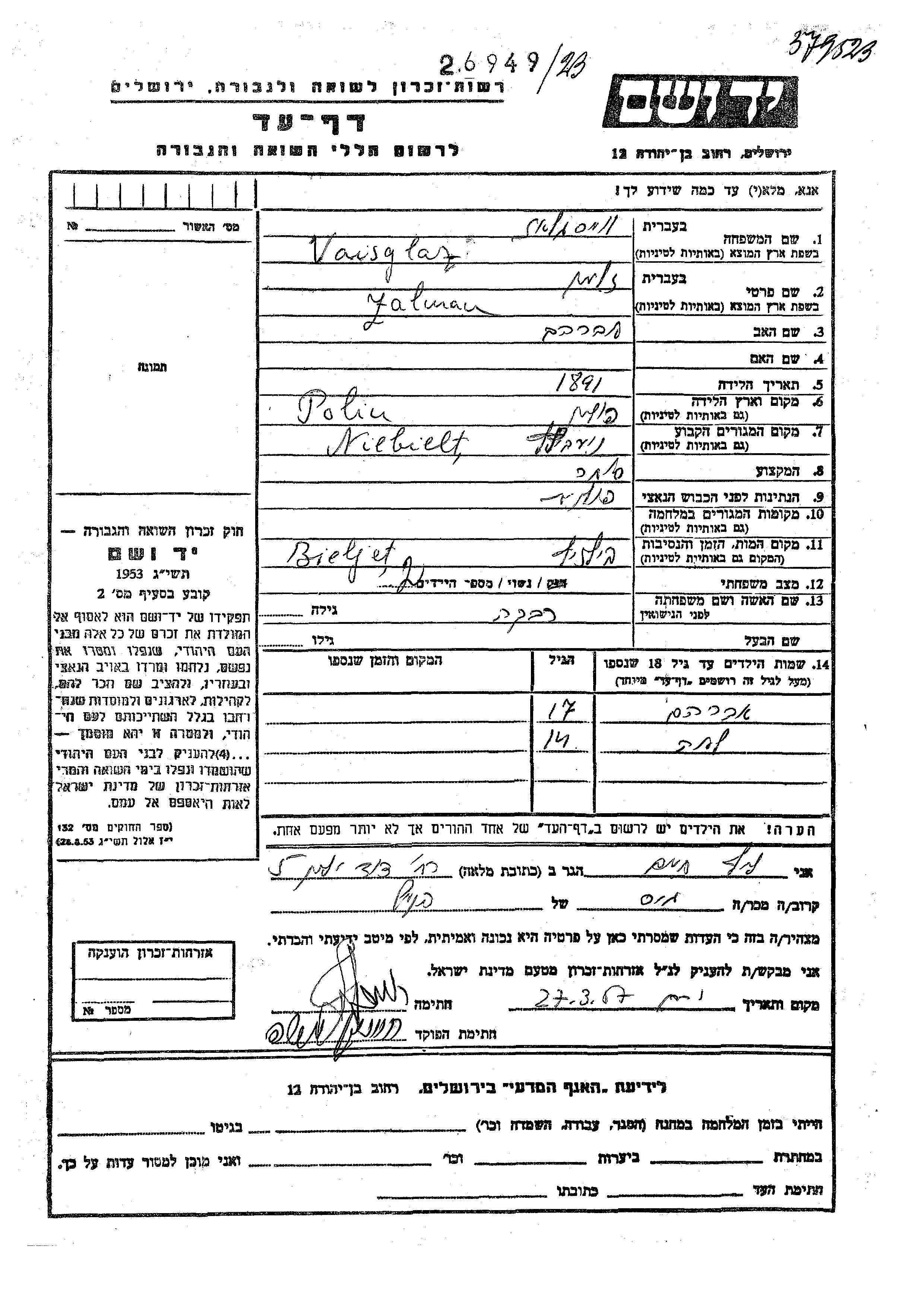 Vaisglaz Avraham Niebylec, Polen Gedenkblatt