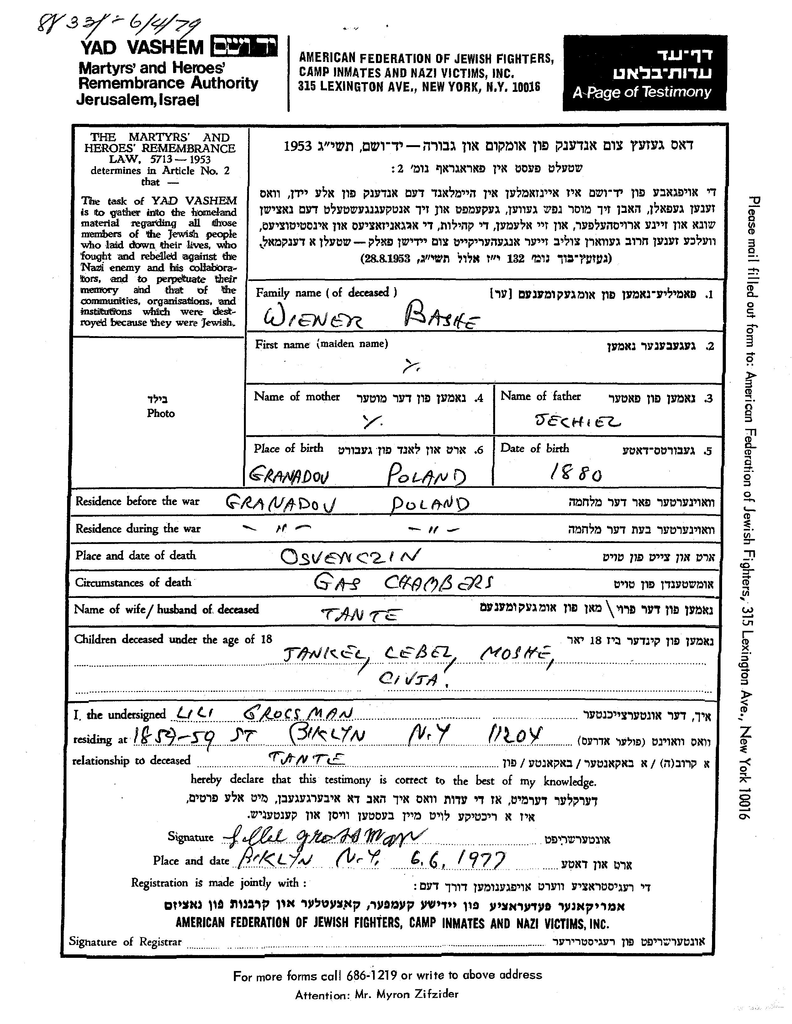 Civja Wiener wurde Sie war die Tochter von Basha. Sie war Kind. Vor dem Zweiten Weltkrieg lebte sie in Granadov, Polen. Während des Krieges war sie in Granadov, Polen.