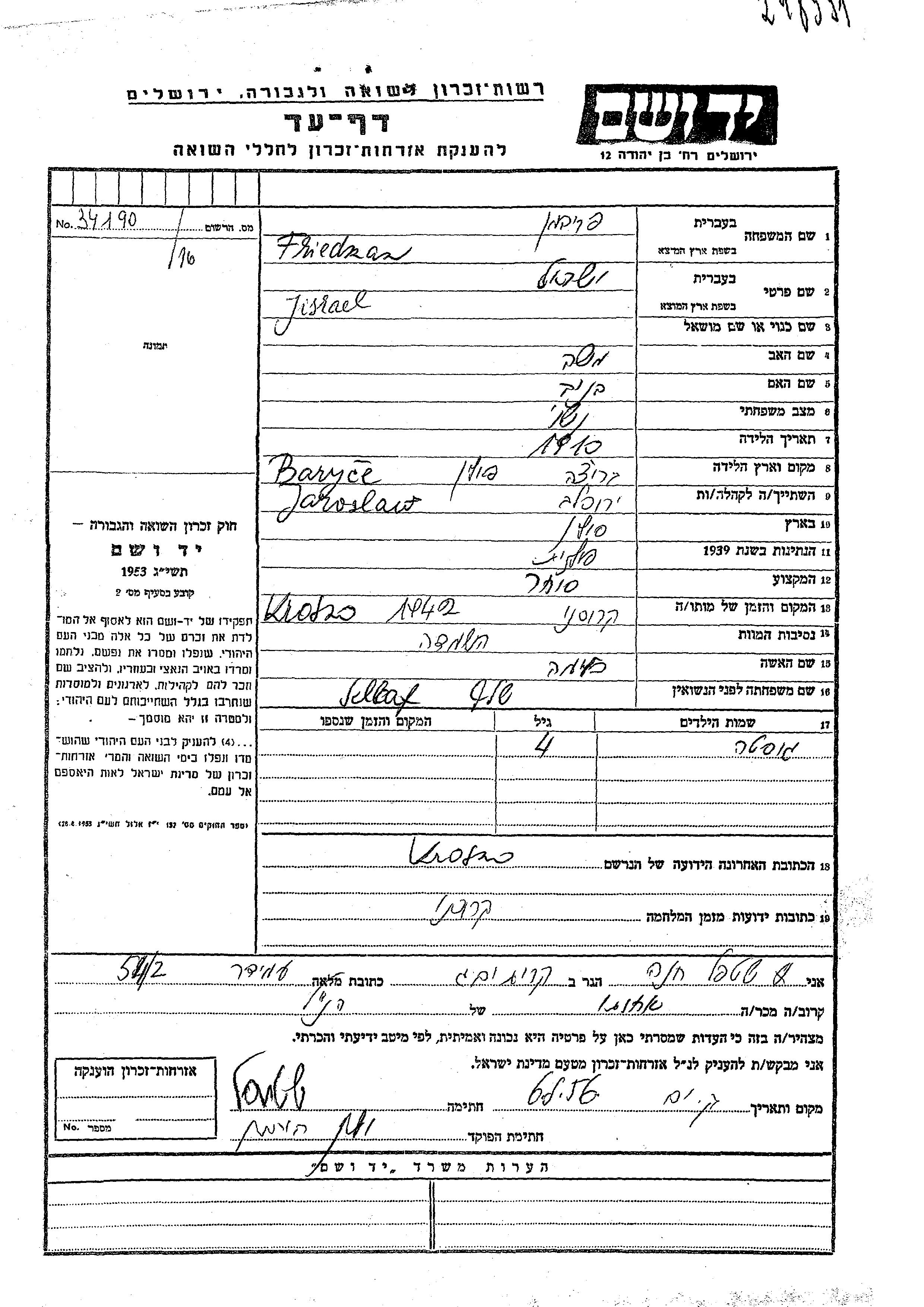 Gusta Friedman wurde Sie war die Tochter von Jisrael und Bluma, geb. Szlaf. Sie war Kind. Vor dem Zweiten Weltkrieg lebte sie in Jaroslaw, Polen. Während des Krieges war sie in Krosno.