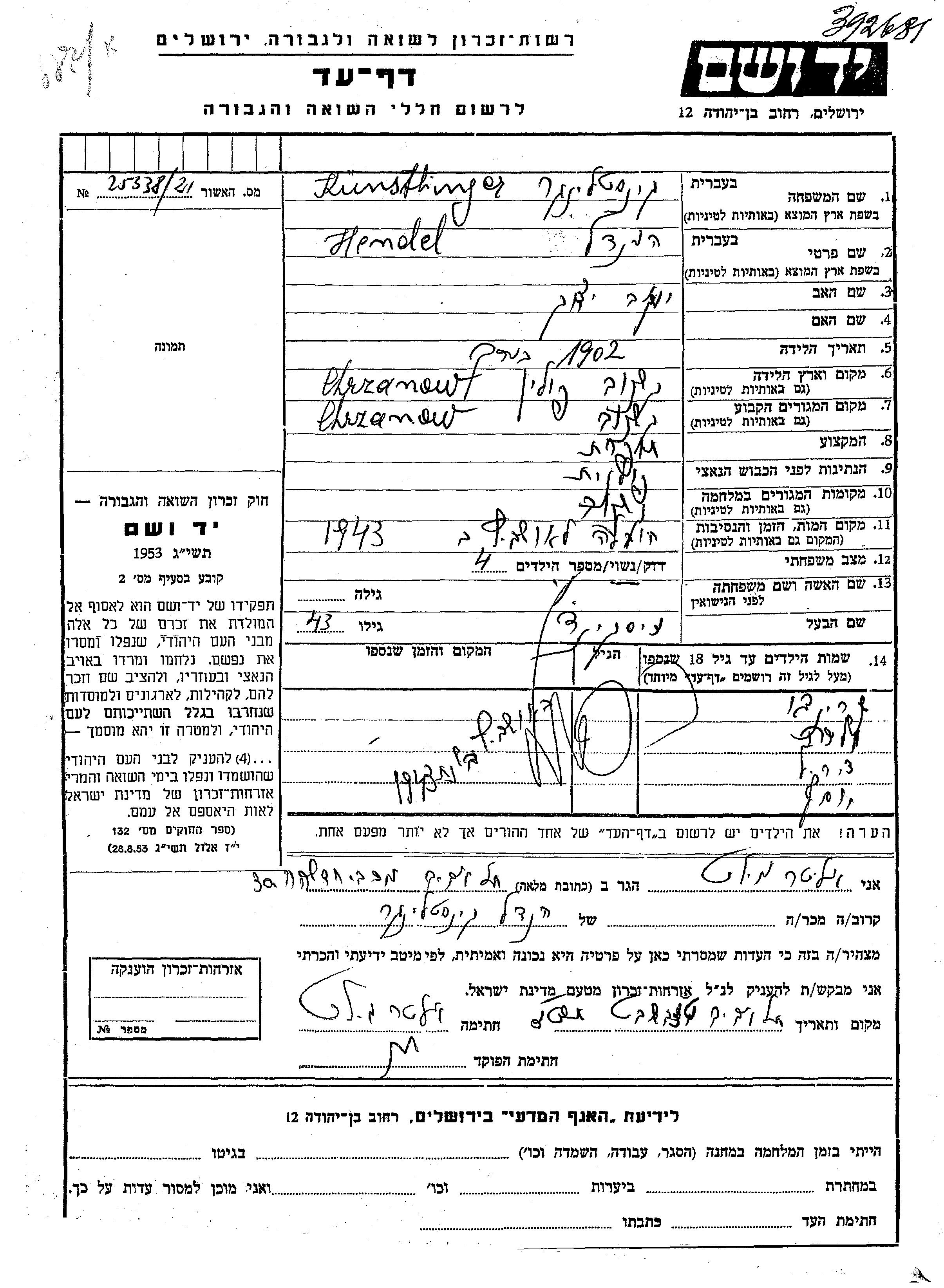 Shprintza Künstlinger wurde Sie war die Tochter von Hindel Hendel, geb. Ziskind. Sie war Kind. Vor dem Zweiten Weltkrieg lebte sie in Chrzanow, Polen. Während des Krieges war sie in Chrzanow, Polen.