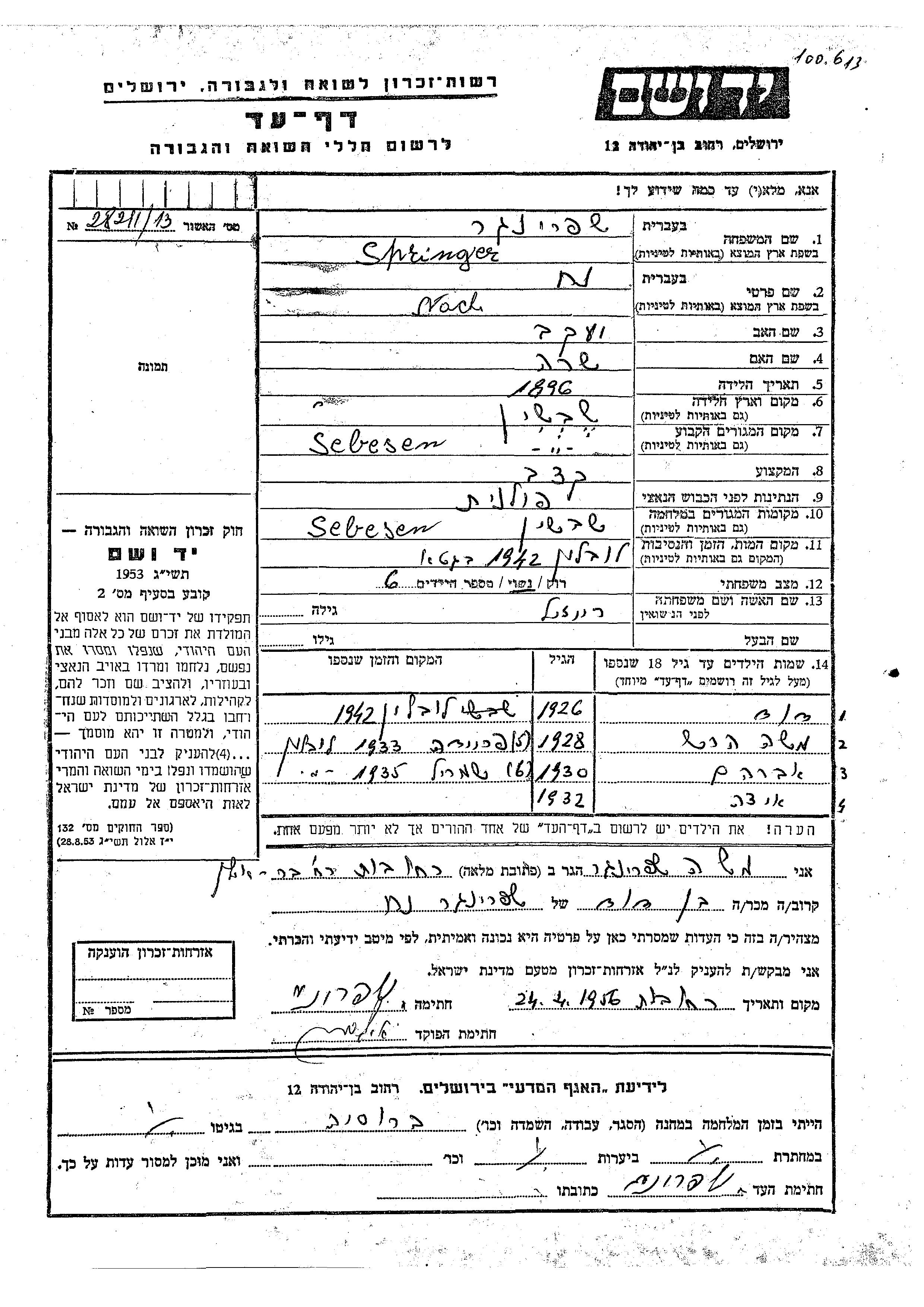 Moshe Hersh Springer wurde im Jahr 1928 geboren. Er war der Sohn von Noch und Reizil. Er war Kind. Vor dem Zweiten Weltkrieg lebte er in Szczebrzeszyn, Polen. Während des Krieges war er in Szczebrzeszyn, Polen.