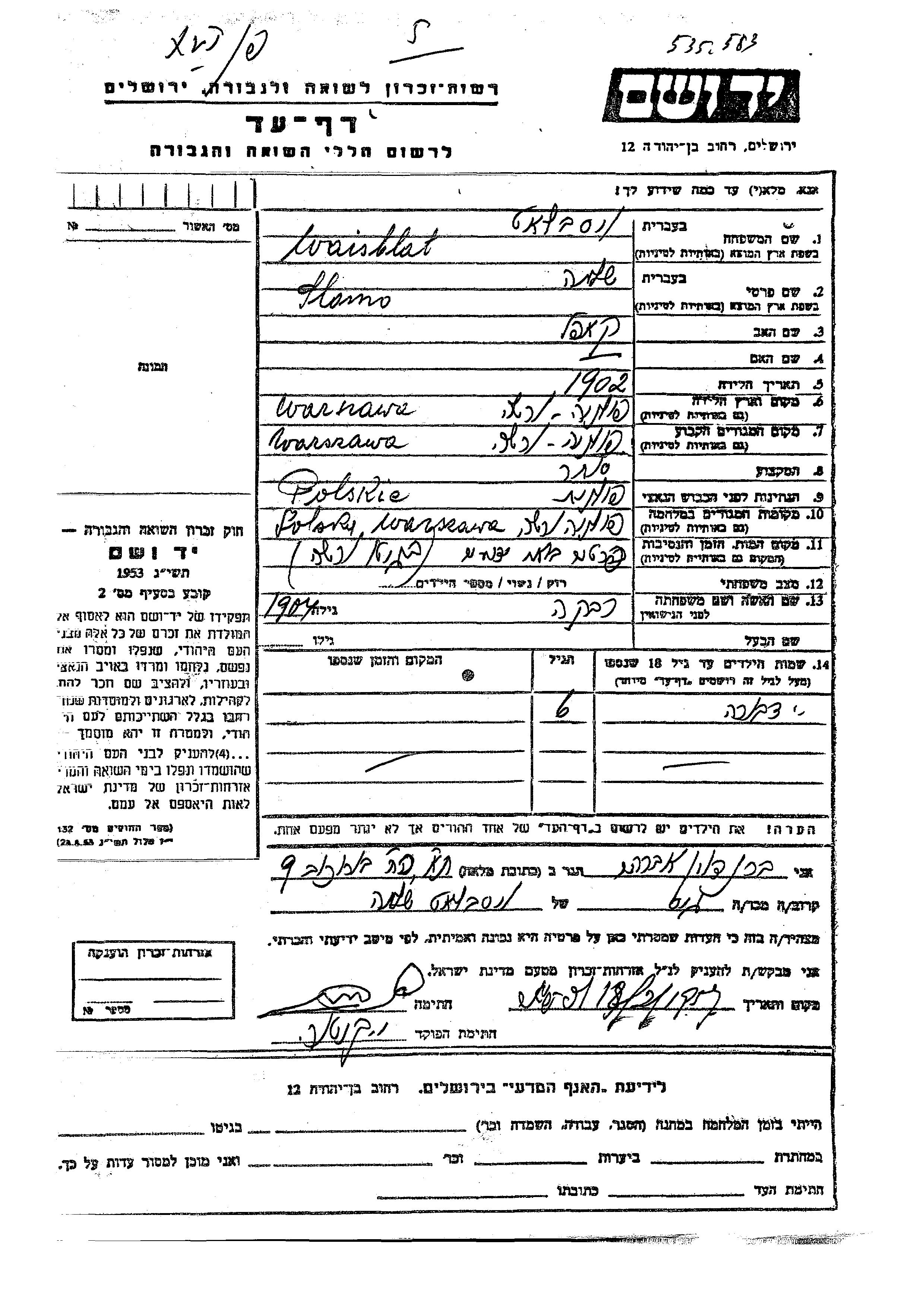 Waisblatt Dvora Warszawa, Polen Gedenkblatt