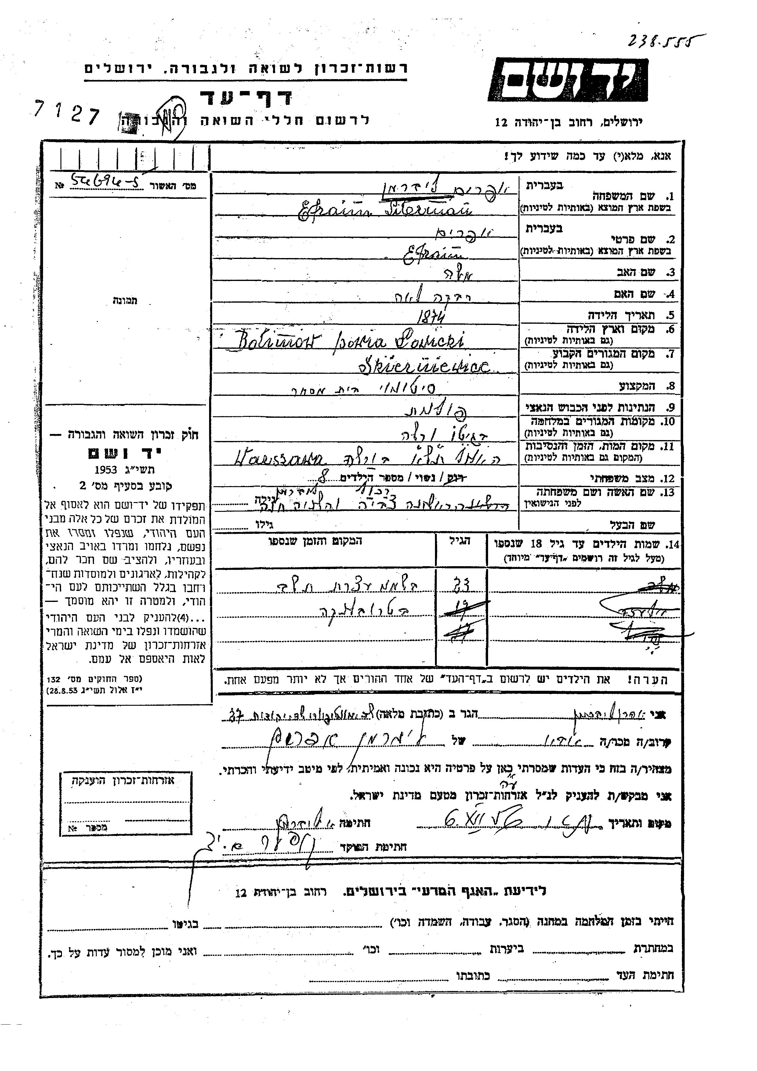Yosef Liberman wurde Er war der Sohn von Efraim und Tzvia. Er war Kind. Vor dem Zweiten Weltkrieg lebte er in Skierniew, Polen. Während des Krieges war er in Warszawa, Polen.