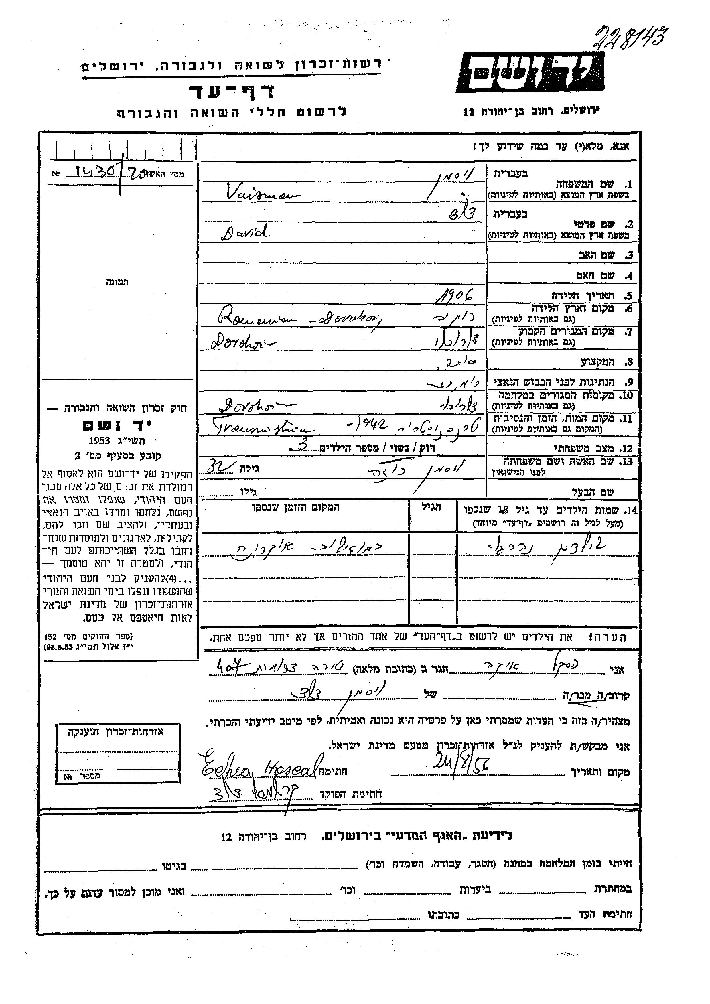 Vaisman David 1906 Dorohoi, Rumänien Gedenkblatt