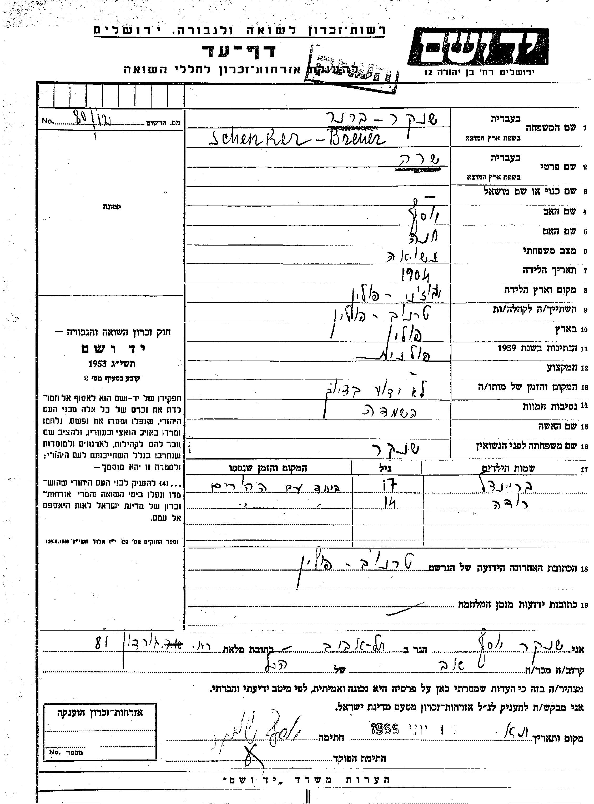 Braindel Brener wurde Sie war die Tochter von Sara, geb. Schenker. Sie war Kind. Vor dem Zweiten Weltkrieg lebte sie in Tarnow, Polen.