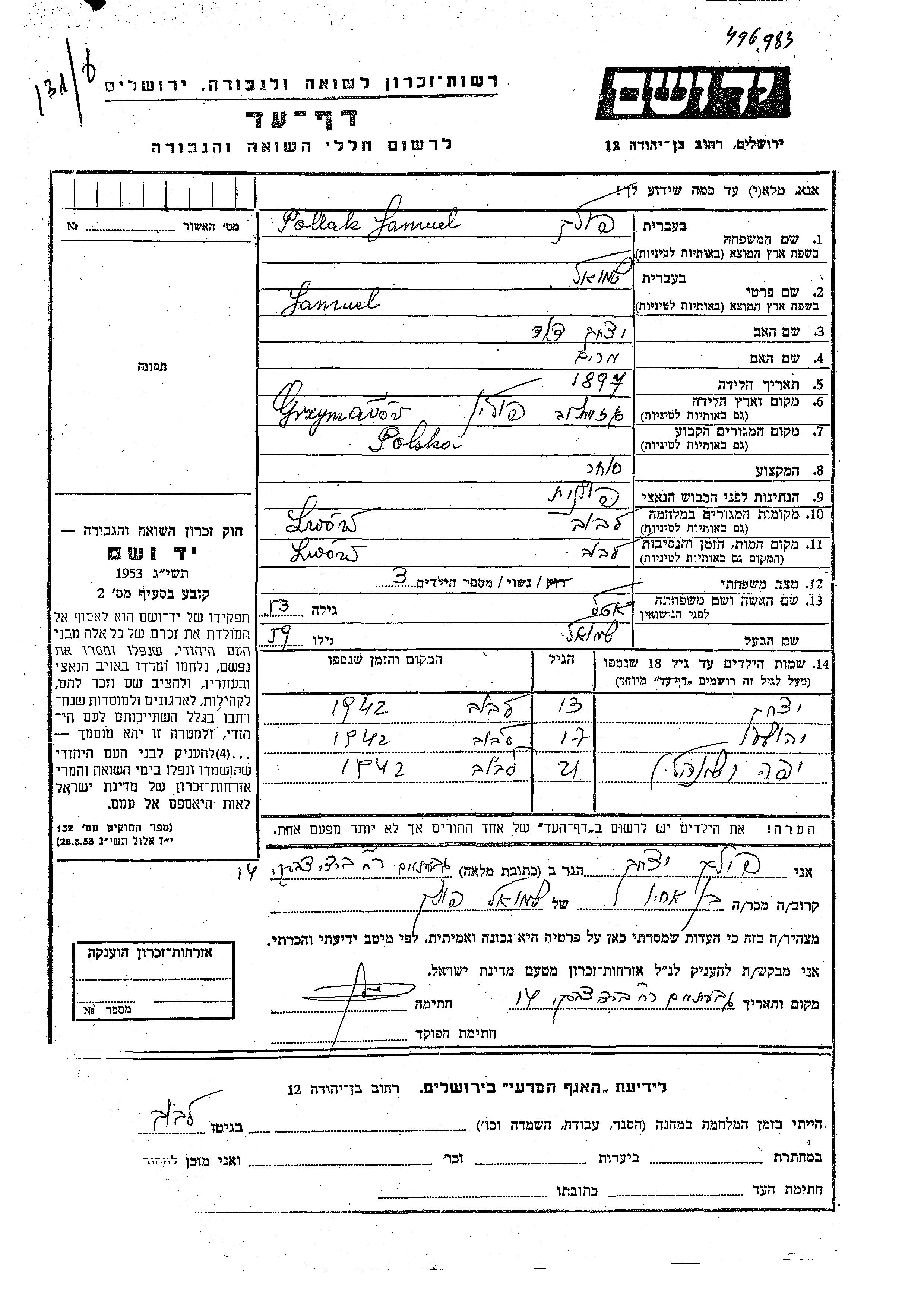Pollak Yafa Sheindl Polen Gedenkblatt