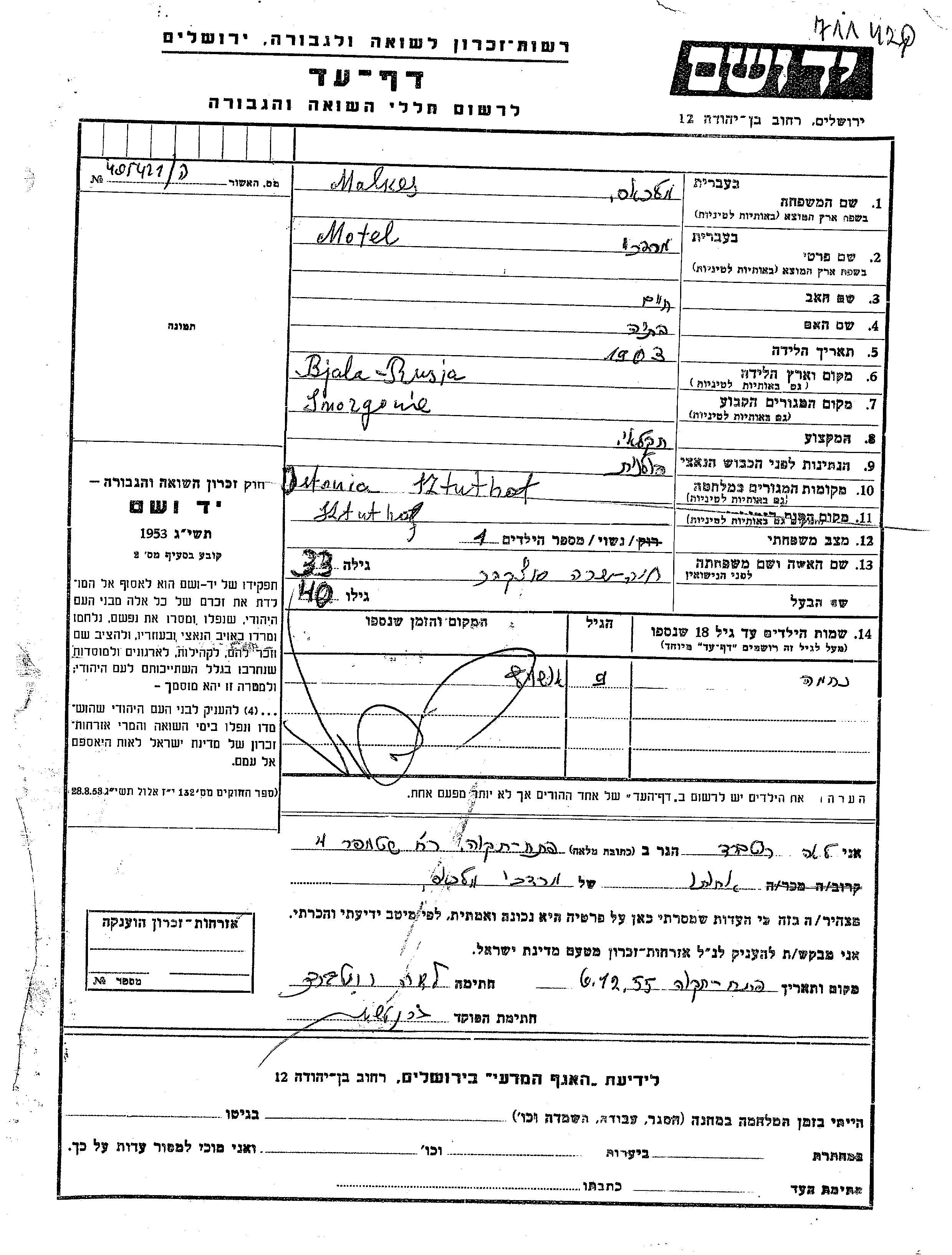Nekhama Melekhs Malkes wurde Er/sie war der/ die Sohn/Tochter von Motel und Khaia Sara, geb. Sutzkover. Er/Sie war Kind.