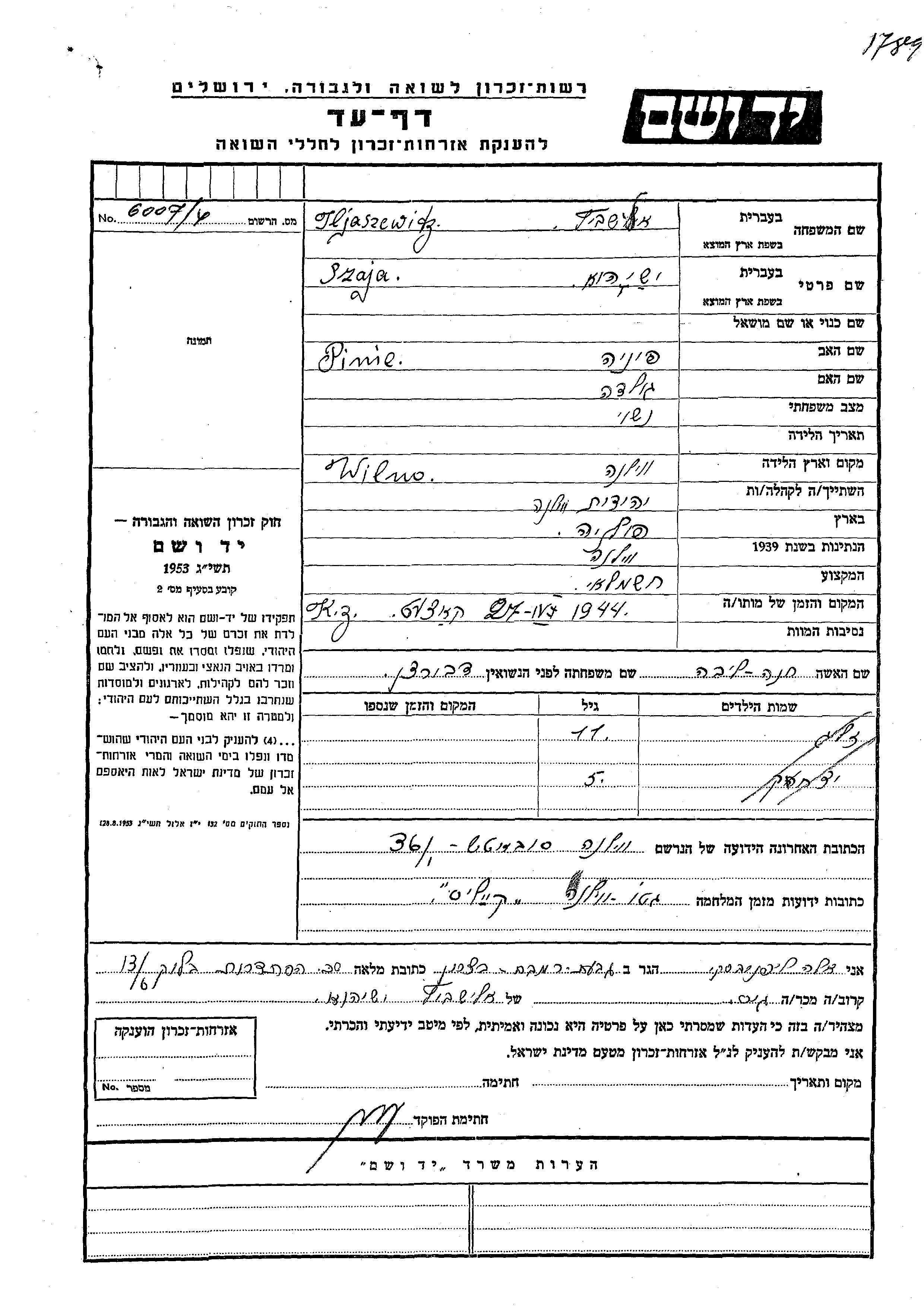 Zelig Iljaszewitz wurde Er war der Sohn von Szaja und Liba Khana, geb. Dvortzan. Er war Kind. Vor dem Zweiten Weltkrieg lebte er in Wilno, Polen. Während des Krieges war er in Wilna, Polen.