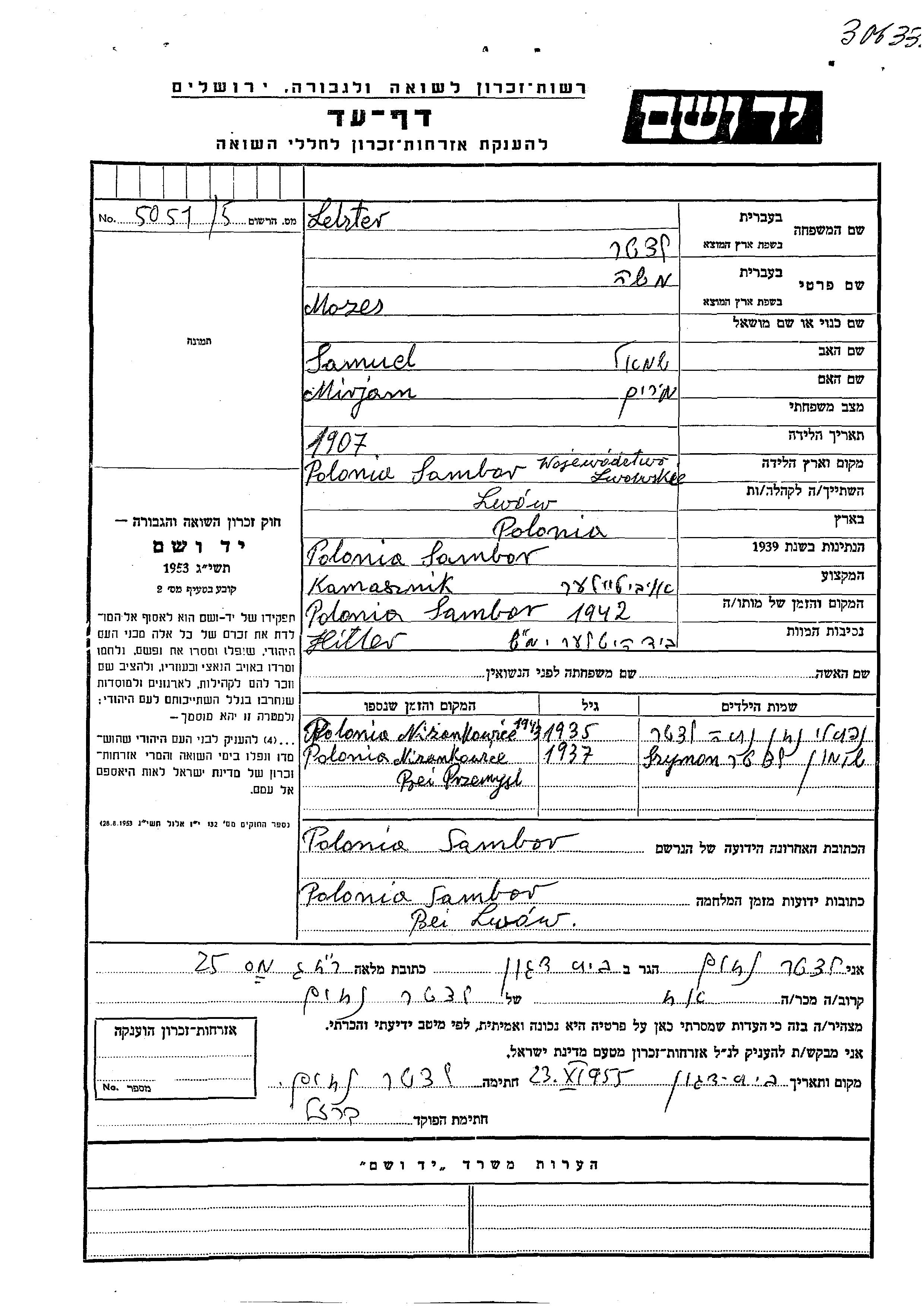 Shimon Letzter wurde Er war der Sohn von Moshe. Er war Kind. Vor dem Zweiten Weltkrieg lebte er in Lwow, Polen. Während des Krieges war er in Sambor, Polen.