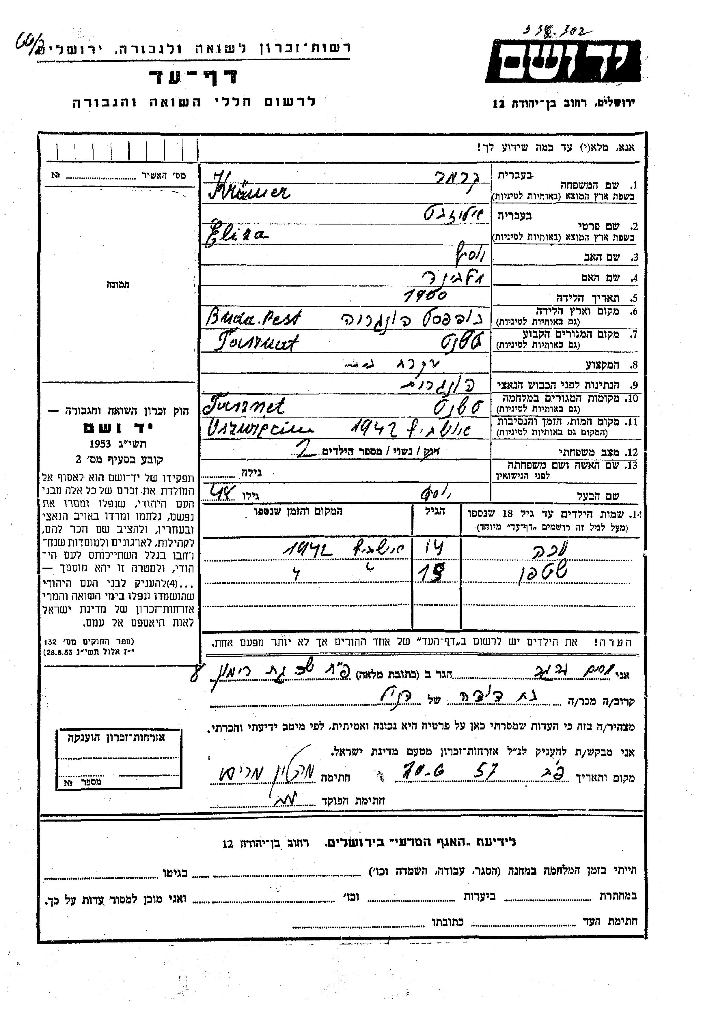 Stefan Krumer Kremer wurde Er war der Sohn von Yosef und Eliza. Er war Kind. Vor dem Zweiten Weltkrieg lebte er in Tasznat, Rumänien. Während des Krieges war er in Tasznat, Rumänien.