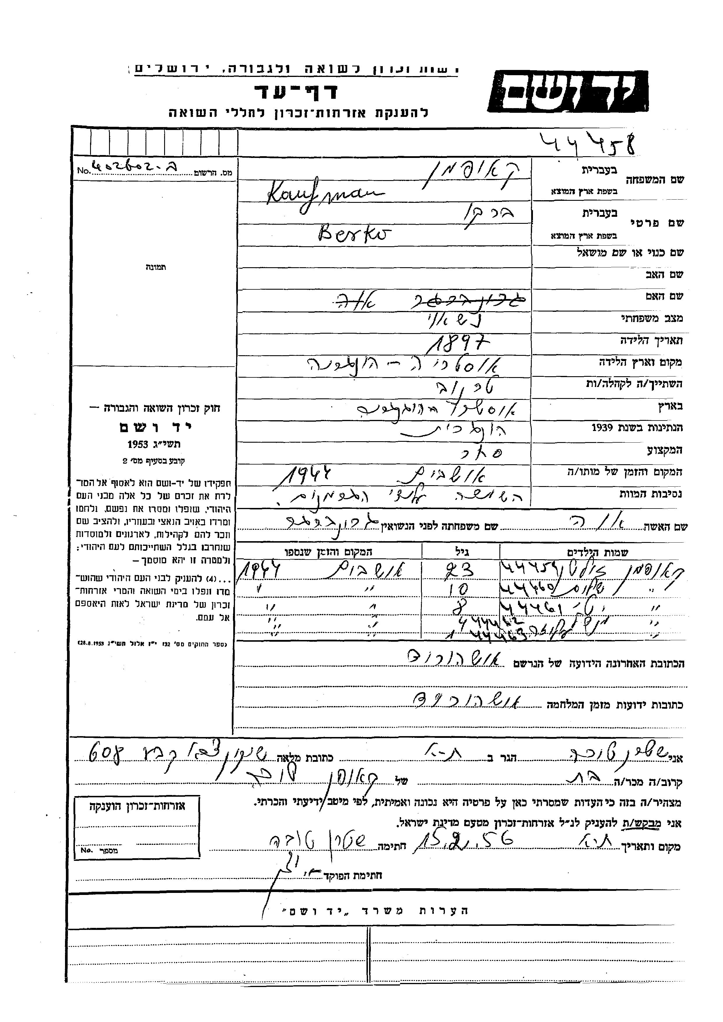Meshel Kaufman wurde Er/sie war der/ die Sohn/Tochter von Berko und Eva, geb. Grinberger. Er/Sie war Kind. Vor dem Zweiten Weltkrieg er/sie in Ternova, Tschechoslowakei. Während des Krieges war er/sie in Oshorod, Tschechoslowakei.
