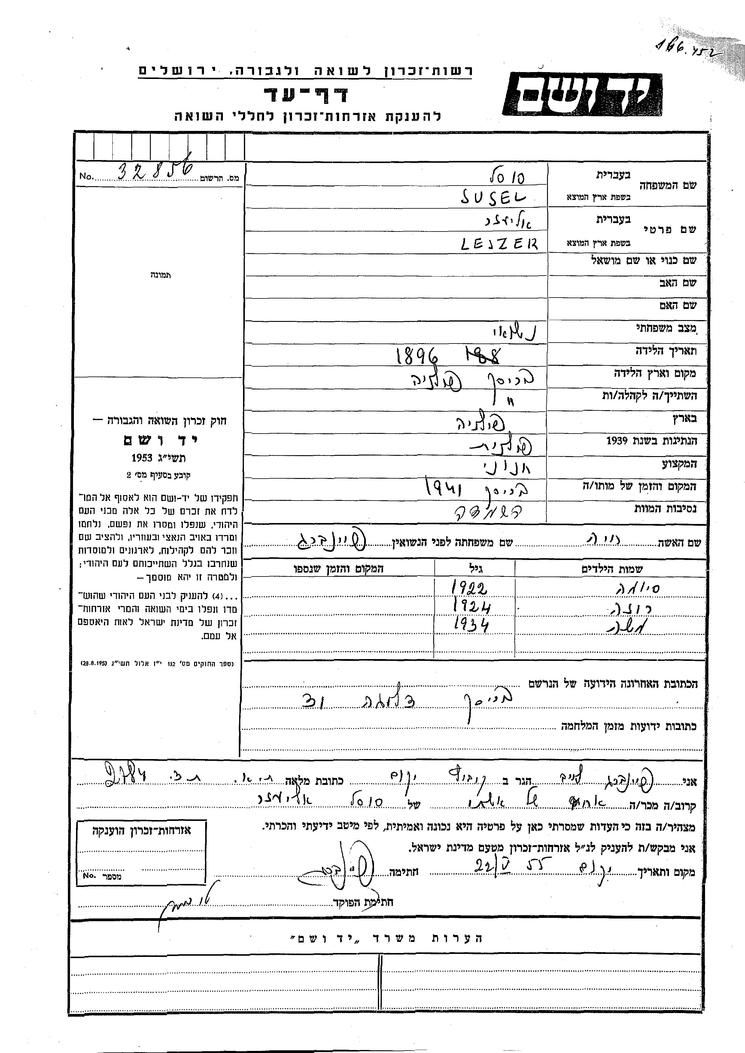Moshe Susel wurde Er war der Sohn von Lejzer und Khaia, geb. Feinberg. Er war Kind. Vor dem Zweiten Weltkrieg lebte er in Brisk, Polen.