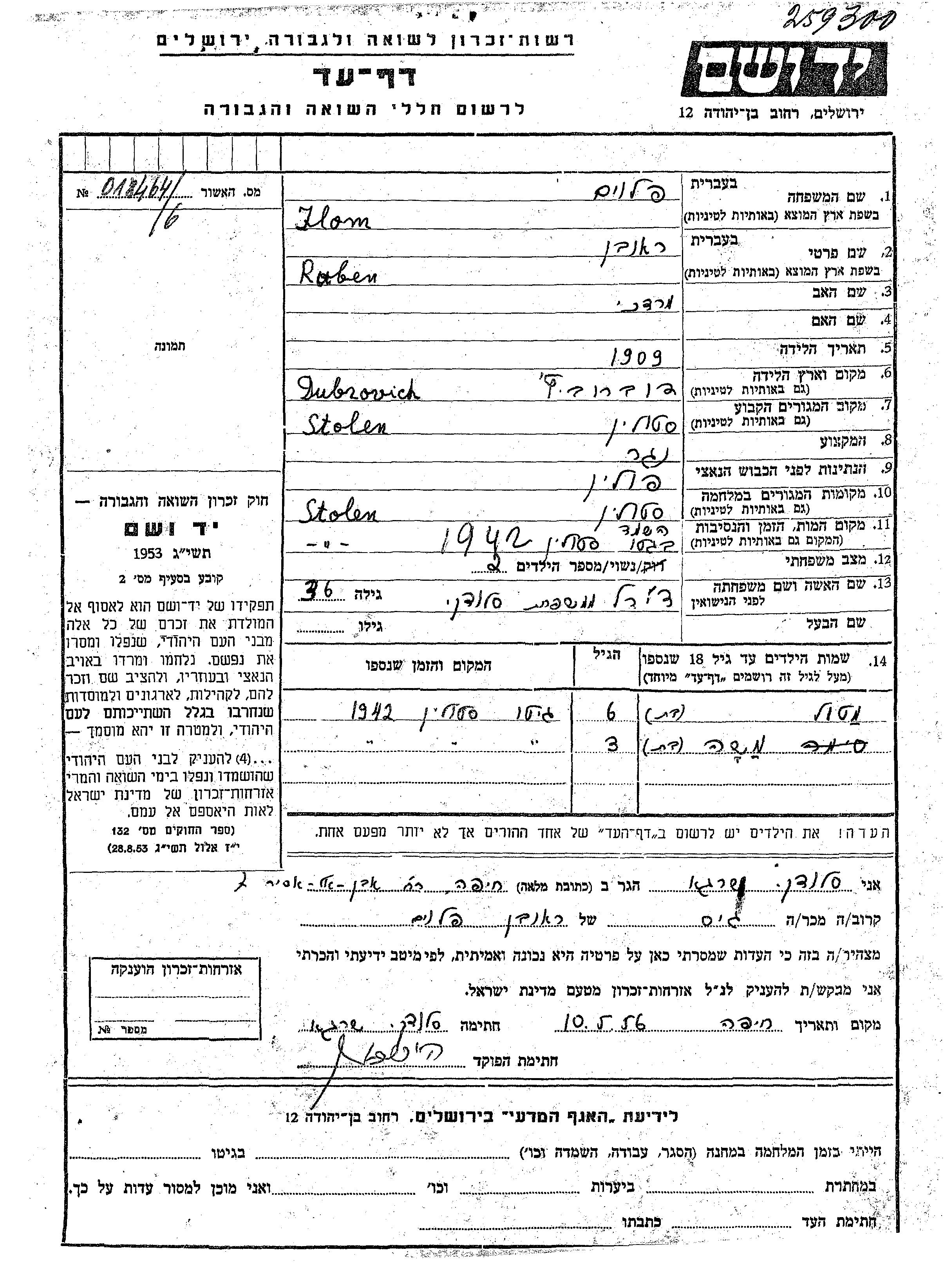 Matul Flom wurde Er/sie war der/ die Sohn/Tochter von Reuven und Tzidel, geb. Slutzki. Er/Sie war Kind. Vor dem Zweiten Weltkrieg er/sie in Stolin, Polen. Während des Krieges war er/sie in Stolin, Polen.