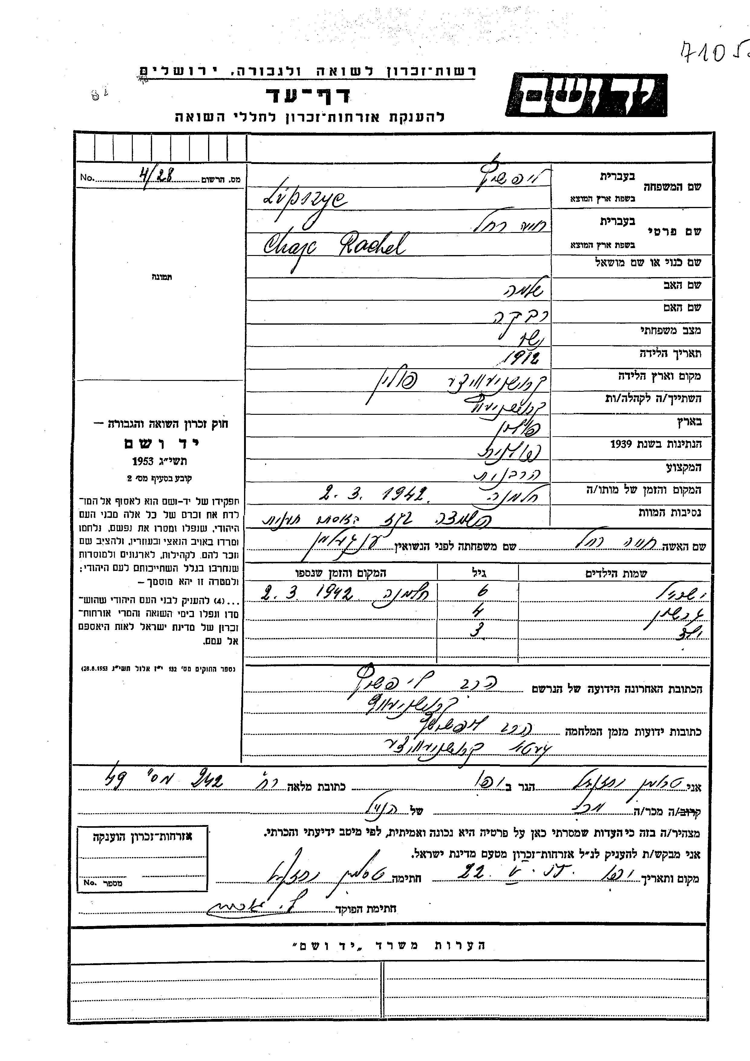 Suche nach einem Todesjahr im Zeitraum der Holocaust: 1933 bis 1945. Bitte wählen Sie 'Exakt' im Auswahlmenü, um nur nach einem einzelnen Jahr zu suchen, alternativ können Sie die flexibleren Optionen '+/- 2 Jahre' oder '+/- 5 Jahre' wählen.