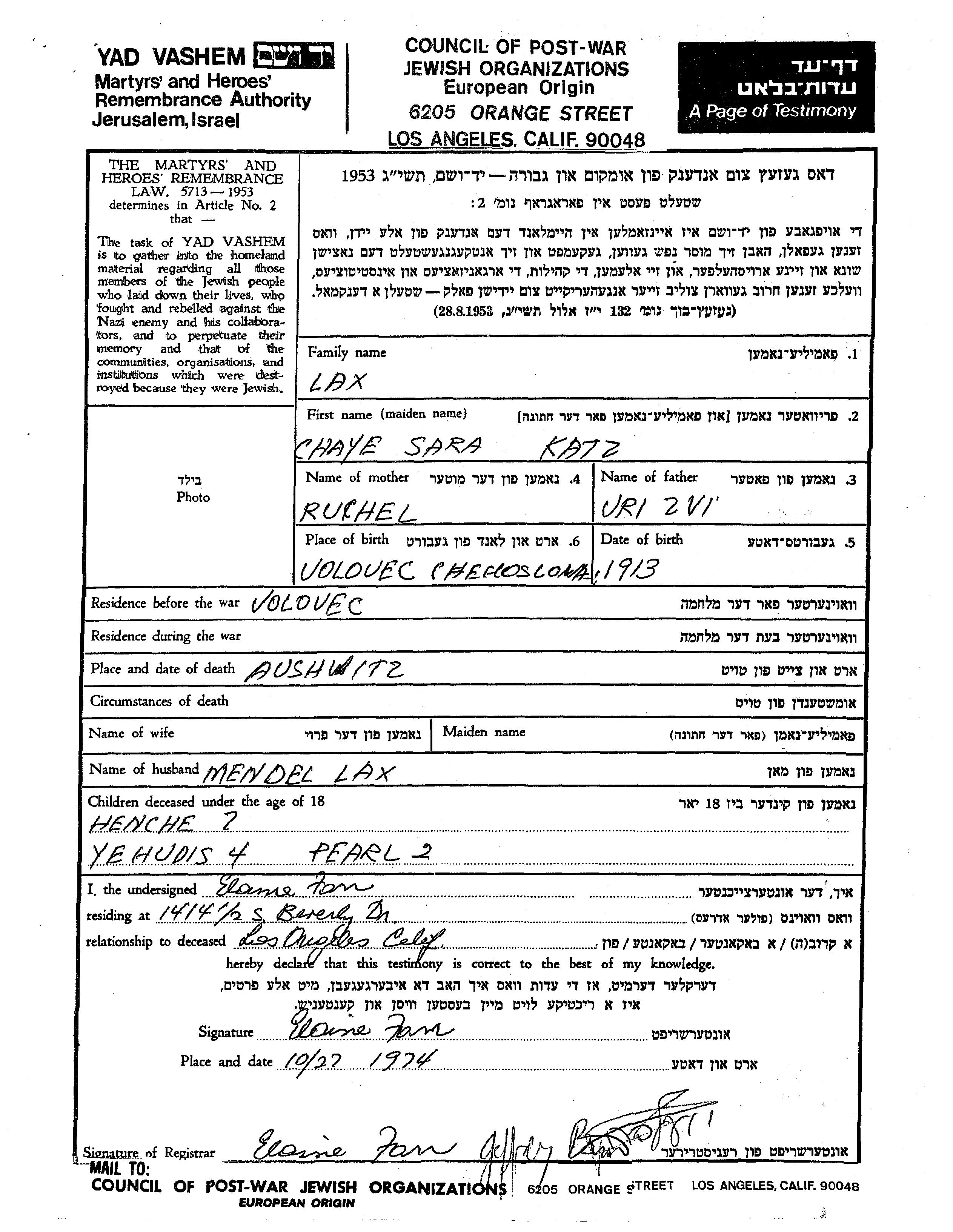 Pearl Lax wurde Sie war die Tochter von Mendel und Chaye Sara, geb. Katz. Sie war Kind. Vor dem Zweiten Weltkrieg lebte sie in Volovec, Tschechoslowakei.
