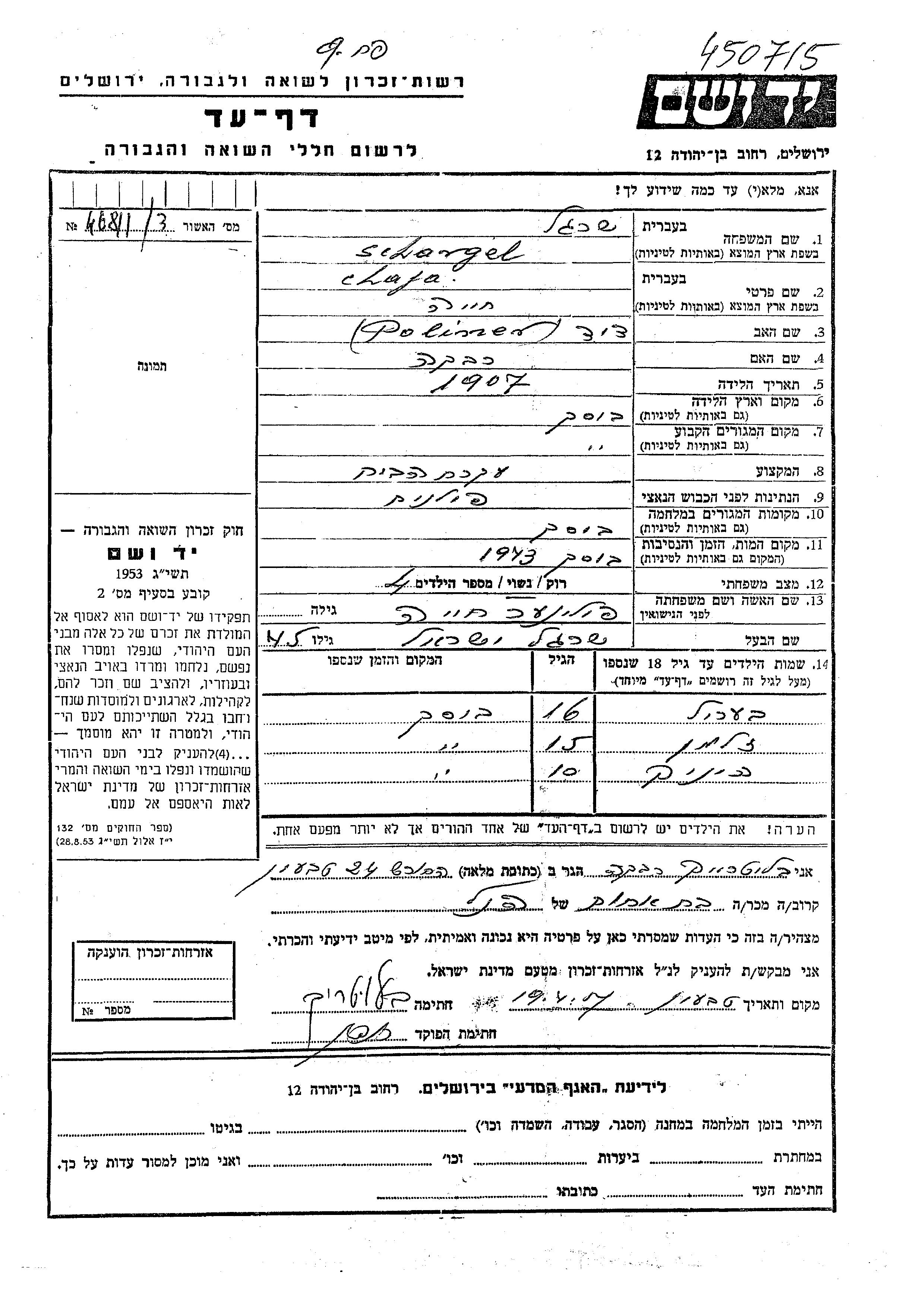 Beril Schargel wurde Er war der Sohn von Yisrael und Chaja, geb. Poliner. Er war Kind. Während des Krieges war er in Busk, Polen.