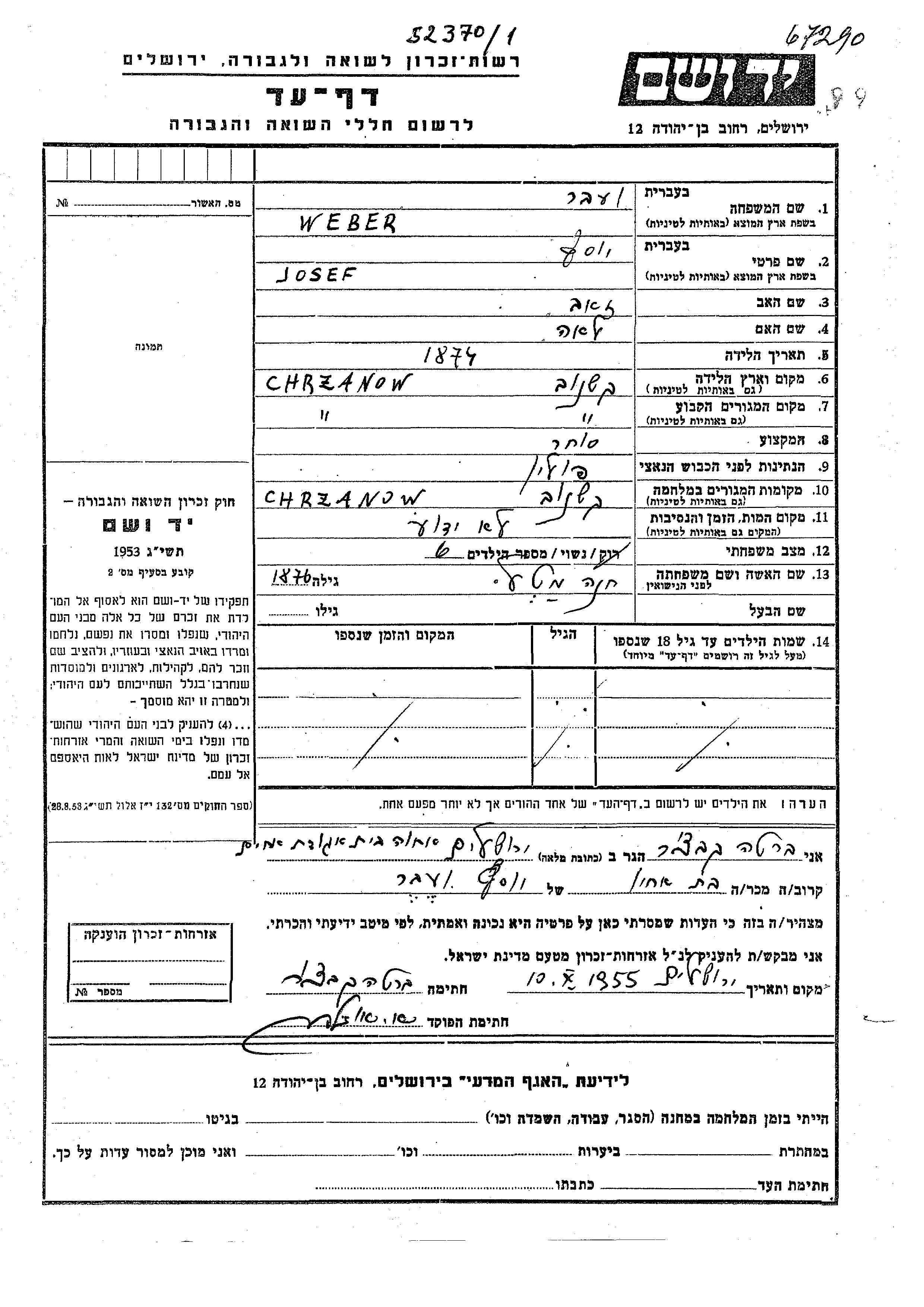 Josef Weber wurde im Jahr 1874 in Chrzanow, Polen geboren. Er war der Sohn von Zeev und Lea. Er war Kaufmann/-frau und mit Khana Matl, geb. Metal Verheiratet. Vor dem Zweiten Weltkrieg lebte er in Chrzanow, Polen. Während des Krieges war er in Chrzanow, Polen.