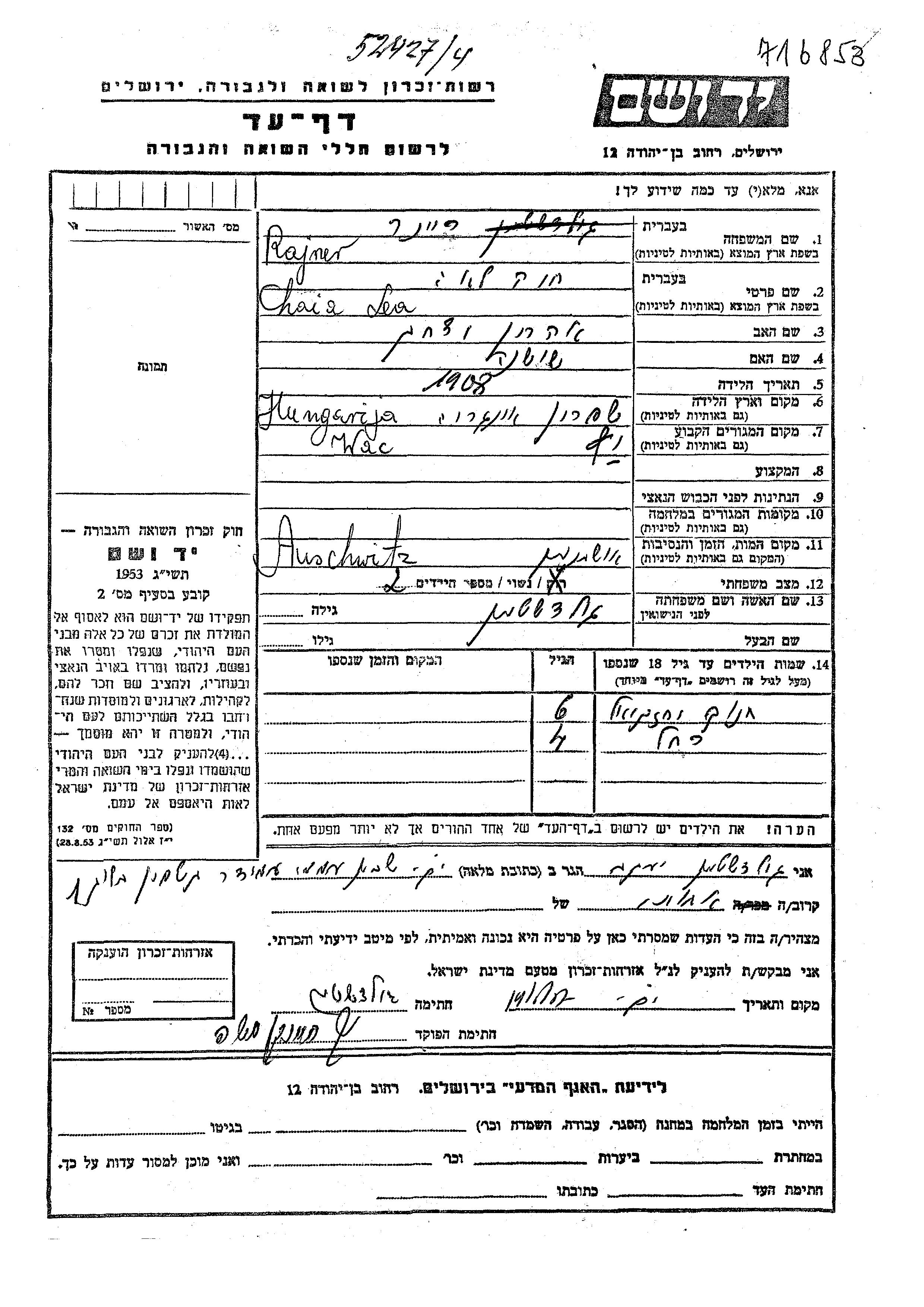 Rakhel Rajner wurde Sie war die Tochter von Chaia Lea, geb. Goldshtein. Sie war Kind. Vor dem Zweiten Weltkrieg lebte sie in Vac, Ungarn.