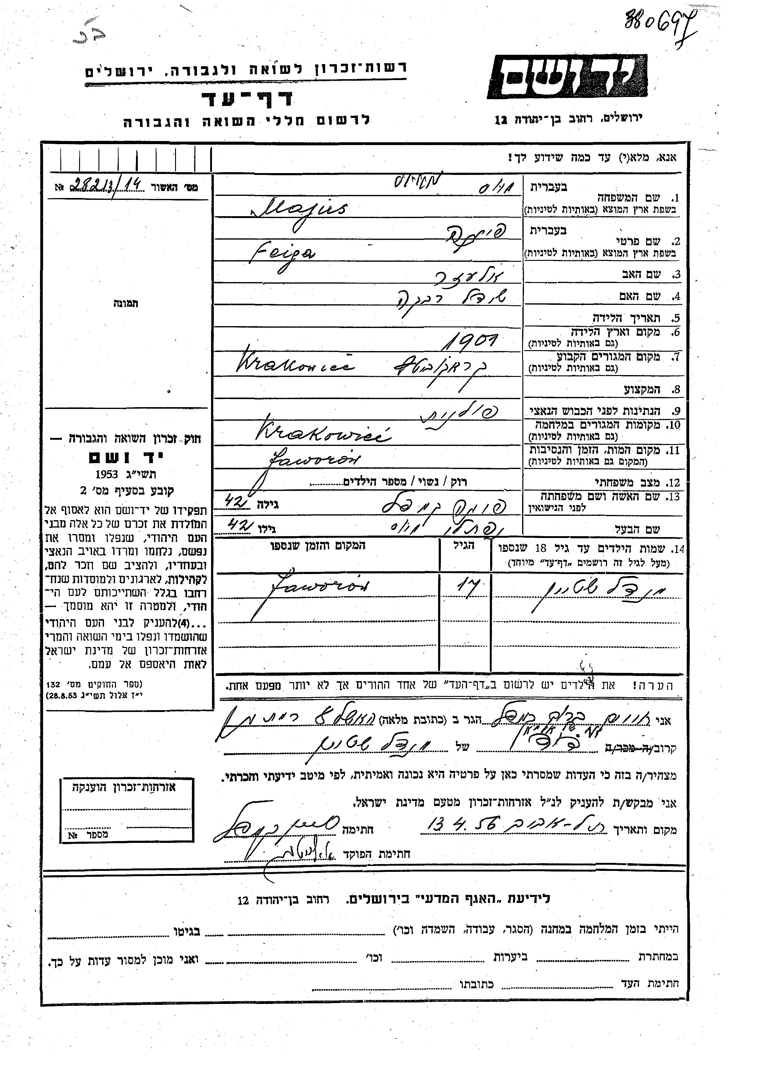 Mendel Majus wurde Er war der Sohn von Naftali und Faiga, geb. Kampel. Er war Kind. Vor dem Zweiten Weltkrieg lebte er in Krakowiec, Polen. Während des Krieges war er in Krakowiec, Polen.