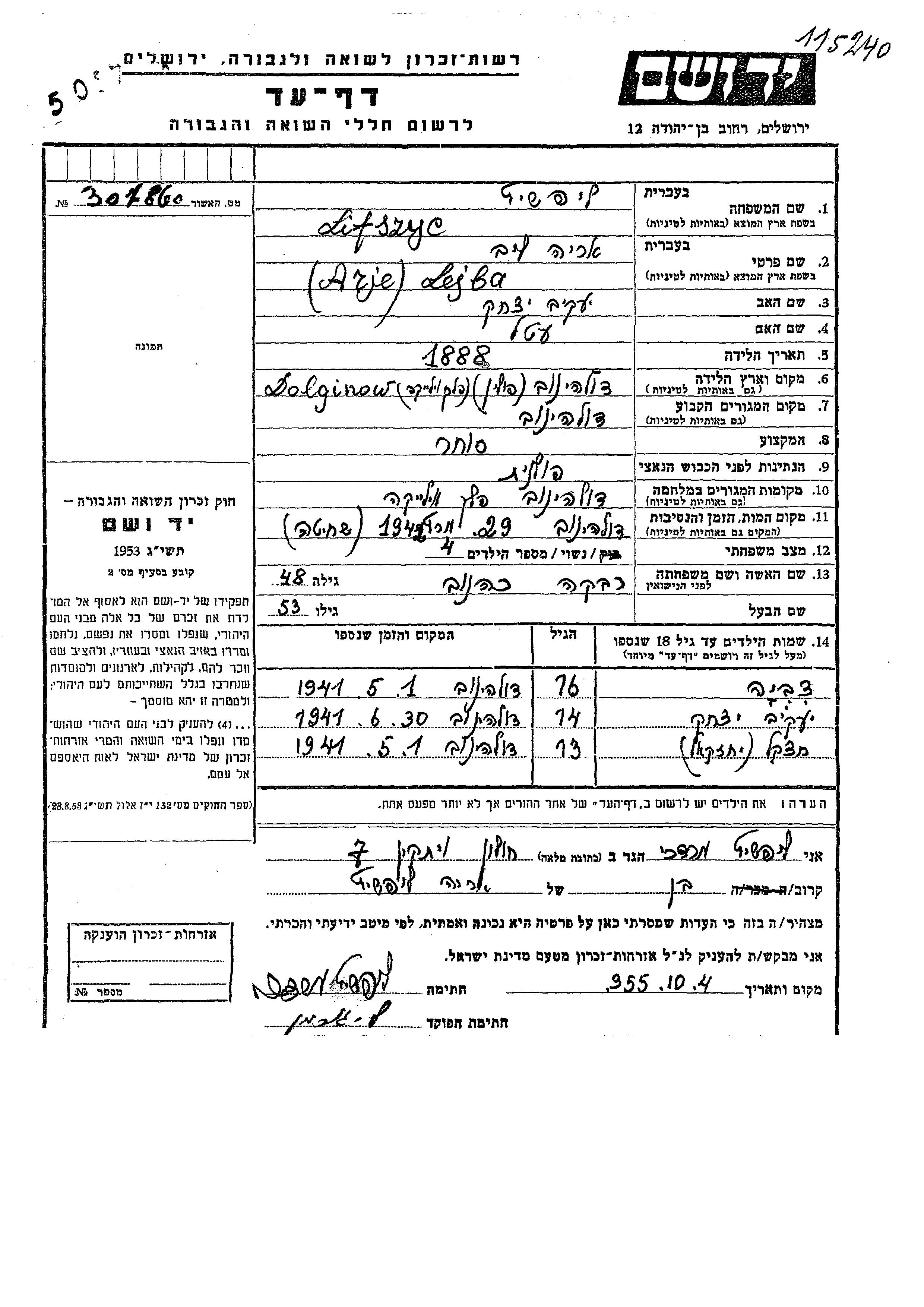 Lifszyc Yaakov Yitzkhak unbekannter Ort, Gedenkblatt