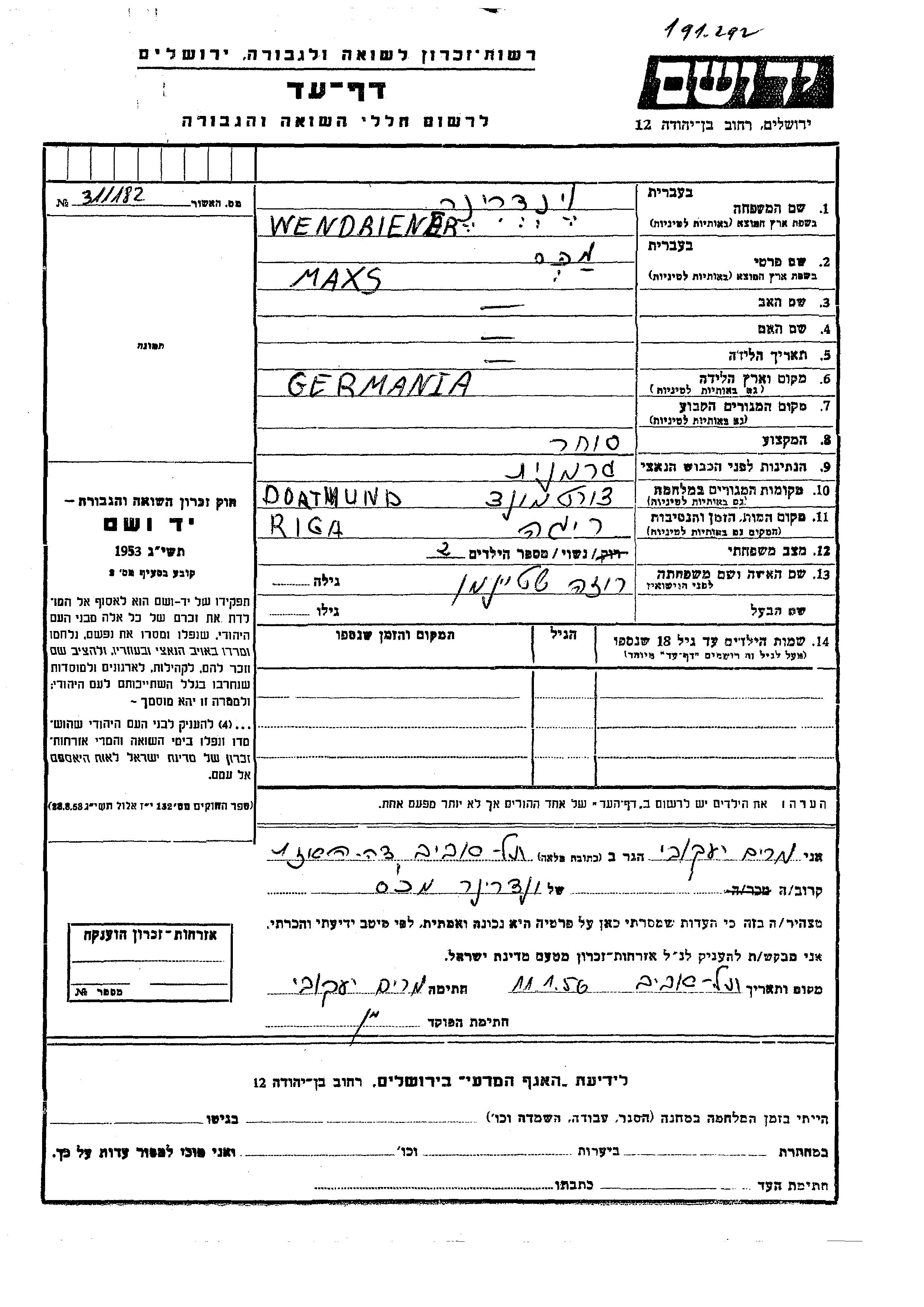 Maxs Wendriener wurde in Deutsches Reich geboren. Er war Kaufmann/-frau und mit Roza, geb. Shteinman Verheiratet. Während des Krieges war er in Dortmund, Deutsches Reich.