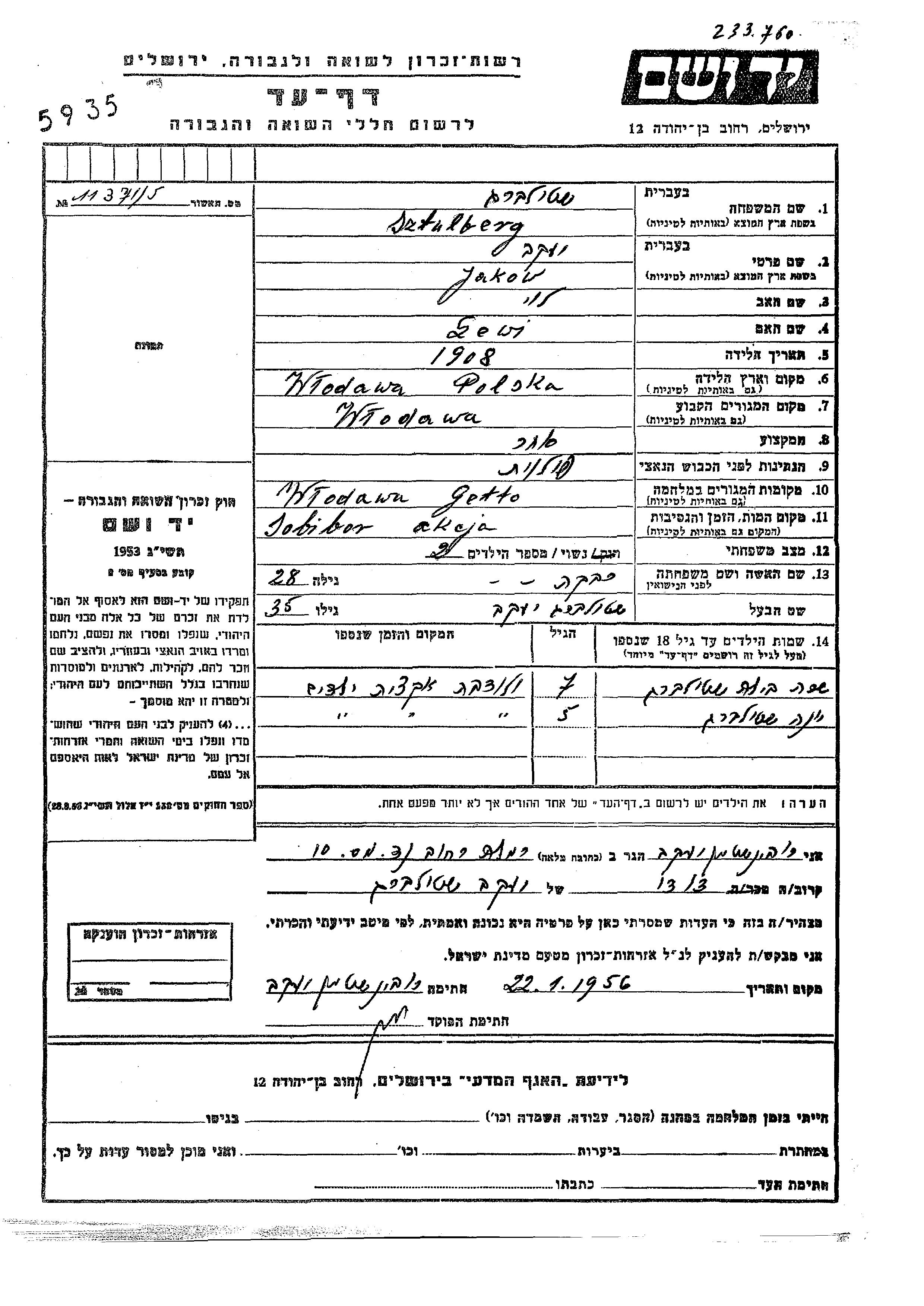Shtulberg Sara Bila Wlodawa, Polen Gedenkblatt
