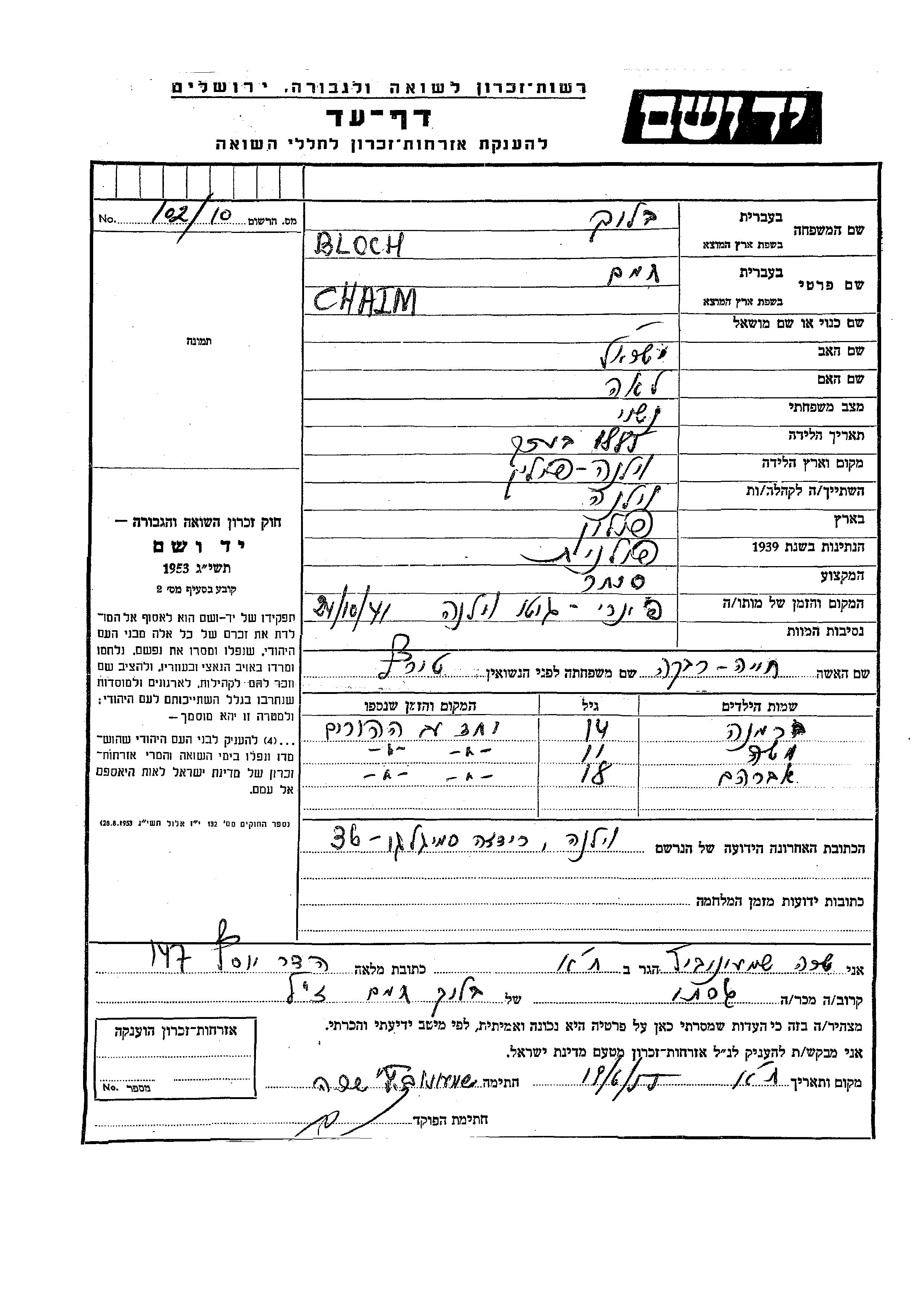 Breina Bloch wurde Sie war die Tochter von Chaim und Khaia Rivka, geb. Tiretz. Sie war Kind. Während des Krieges war sie in Wilno, Polen.