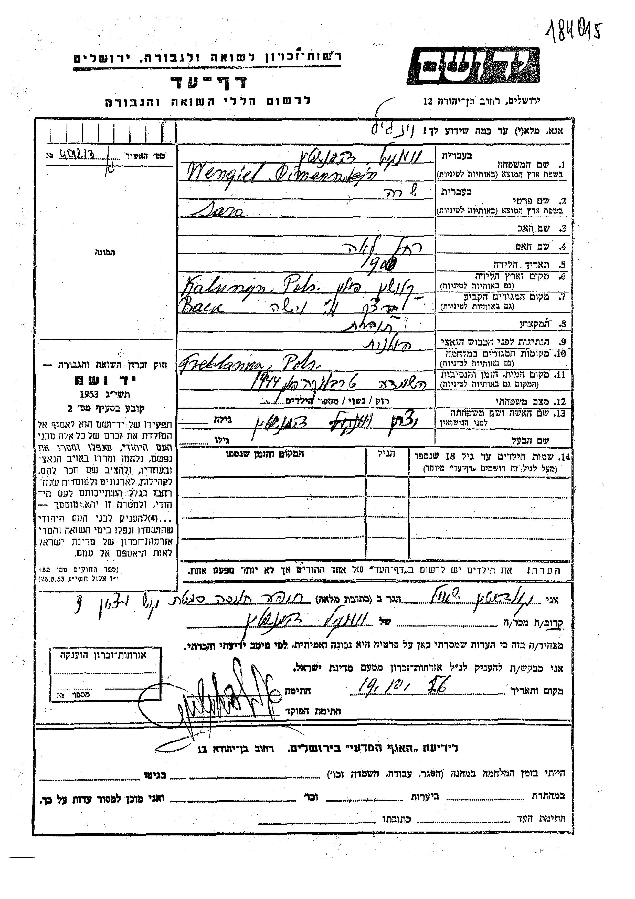 Sara Dimensztejn Węgiel, geb. Wengiel wurde im Jahr 1906 in Kalushin, Polen geboren. Sie war die Tochter von Rakhel Lea. Sie war Schneiderin und mit Yitzkhak Verheiratet. Vor dem Zweiten Weltkrieg lebte sie in Baczki, Polen. Während des Krieges war sie in Treblinka, Polen.