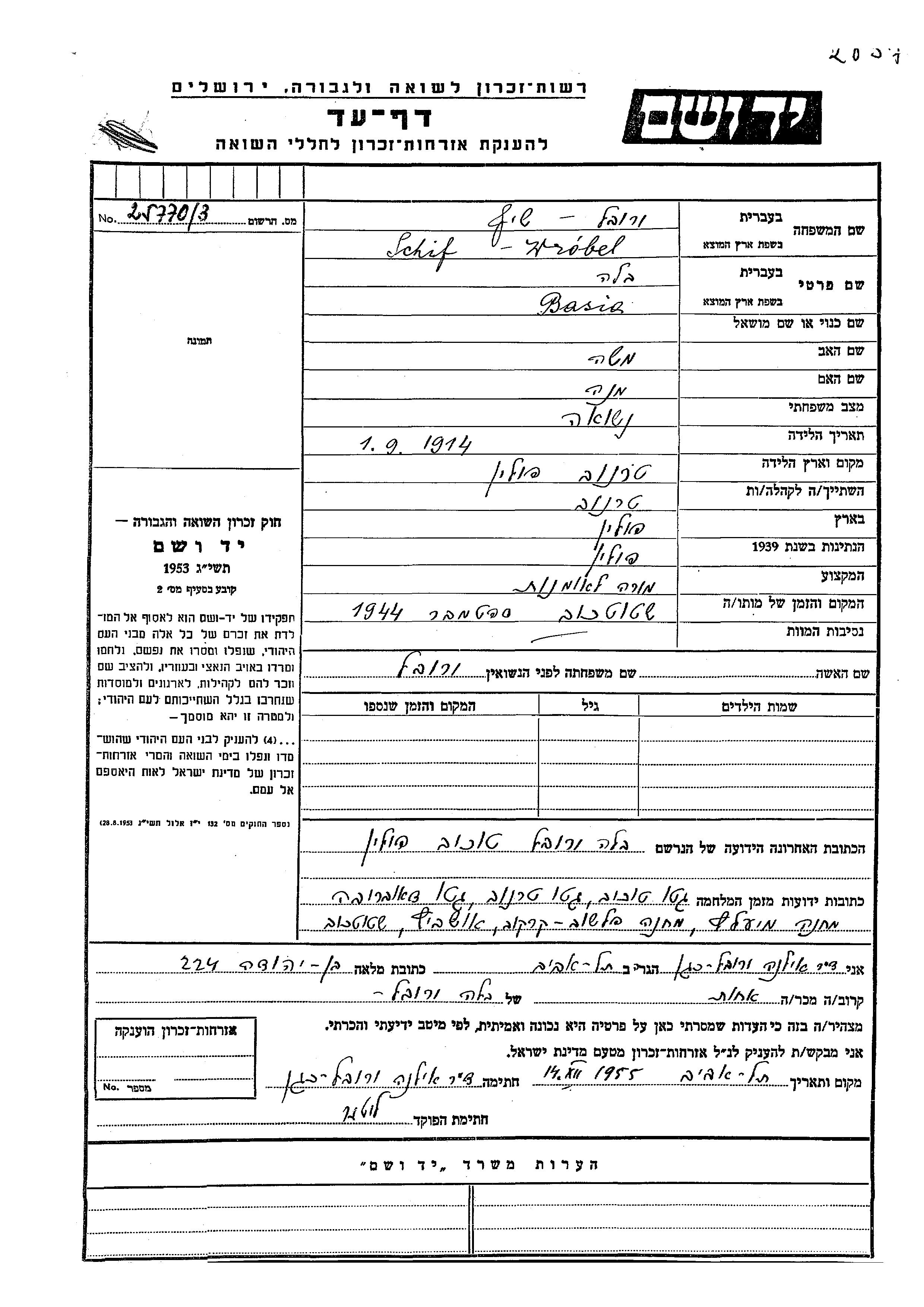 Basia Bela Schif, geb. Wrobel wurde im Jahr 1914 in Tarnow, Polen geboren. Sie war die Tochter von Moshe und Mane. Sie war Lehrer/in und Verheiratet. Vor dem Zweiten Weltkrieg lebte sie in Tuchov, Polen. Während des Krieges war sie in Mielce, Polen.