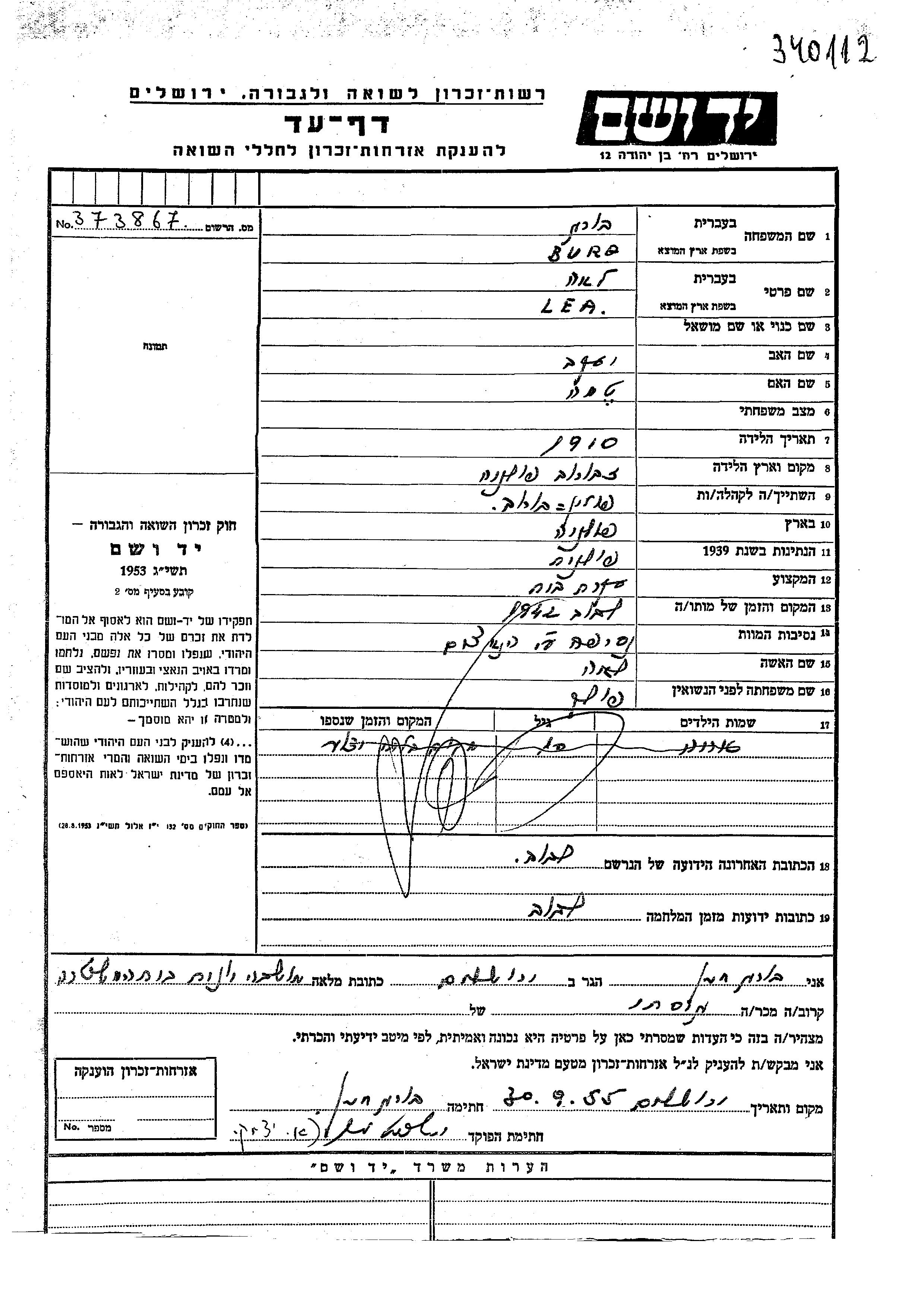 Eva Burg wurde Sie war die Tochter von Lea, geb. Polak. Sie war Kind. Vor dem Zweiten Weltkrieg lebte sie in Lwow, Polen. Während des Krieges war sie in Lwow, Polen.