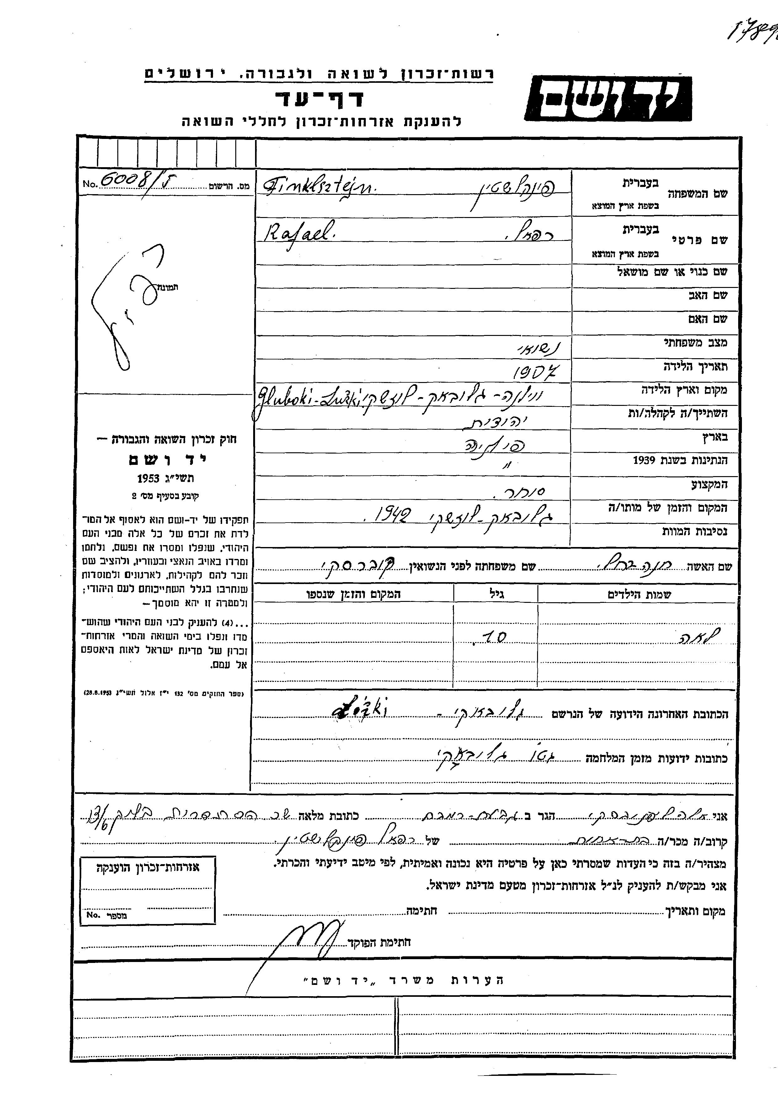 Lea Finklsztejn wurde Sie war die Tochter von Rafael und Khana Rakhel, geb. Kovarski. Sie war Kind. Vor dem Zweiten Weltkrieg lebte sie in Polen. Während des Krieges war sie in Gluboki, Polen.