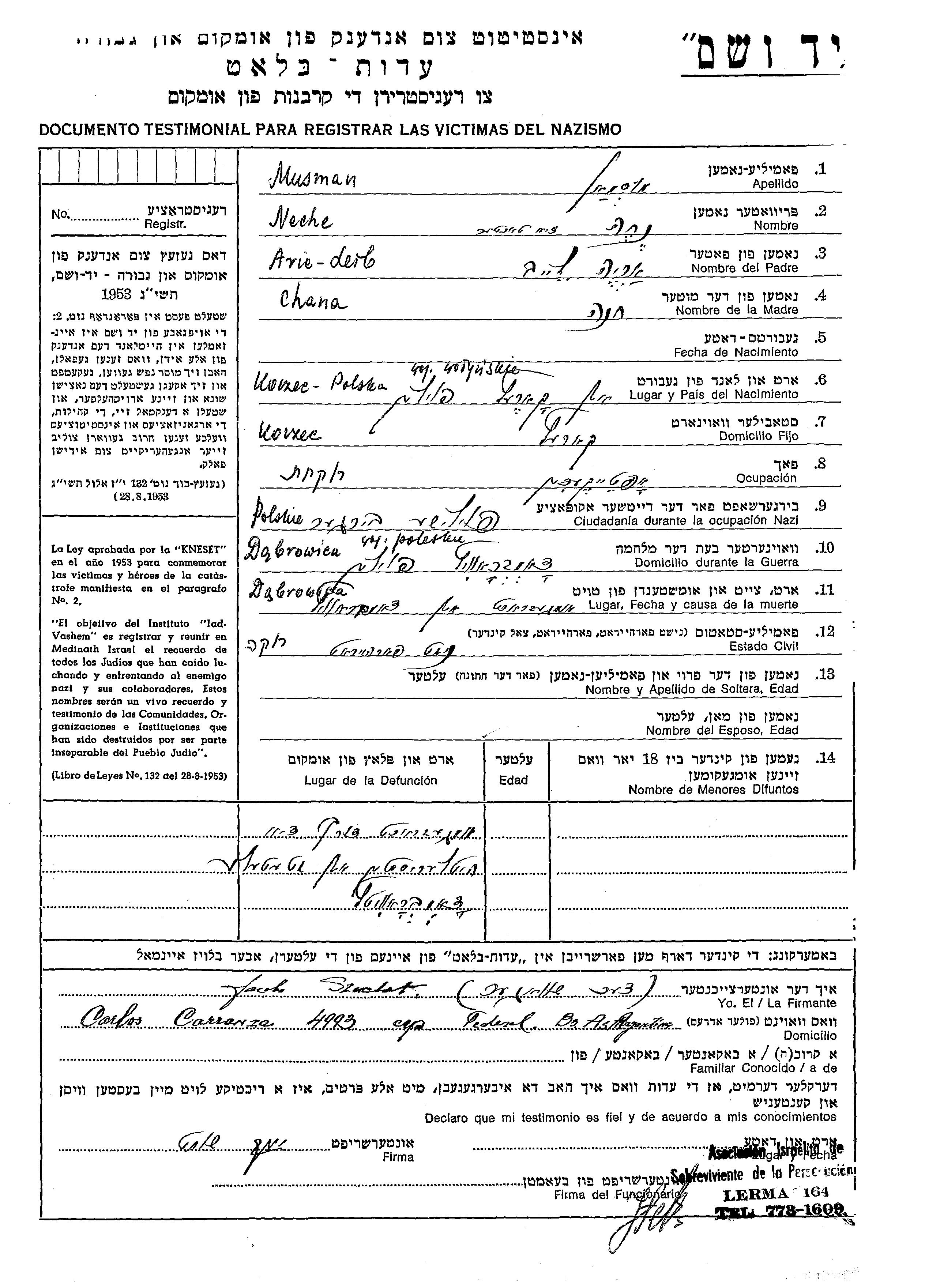 Neche Mosman Musman wurde in Korzec, Polen geboren. Sie war die Tochter von Arie Lieb und Chana. Sie war אפטייקער und Ledig. Vor dem Zweiten Weltkrieg lebte sie in Korzec, Polen. Während des Krieges war sie in Dabrowica, Polen.