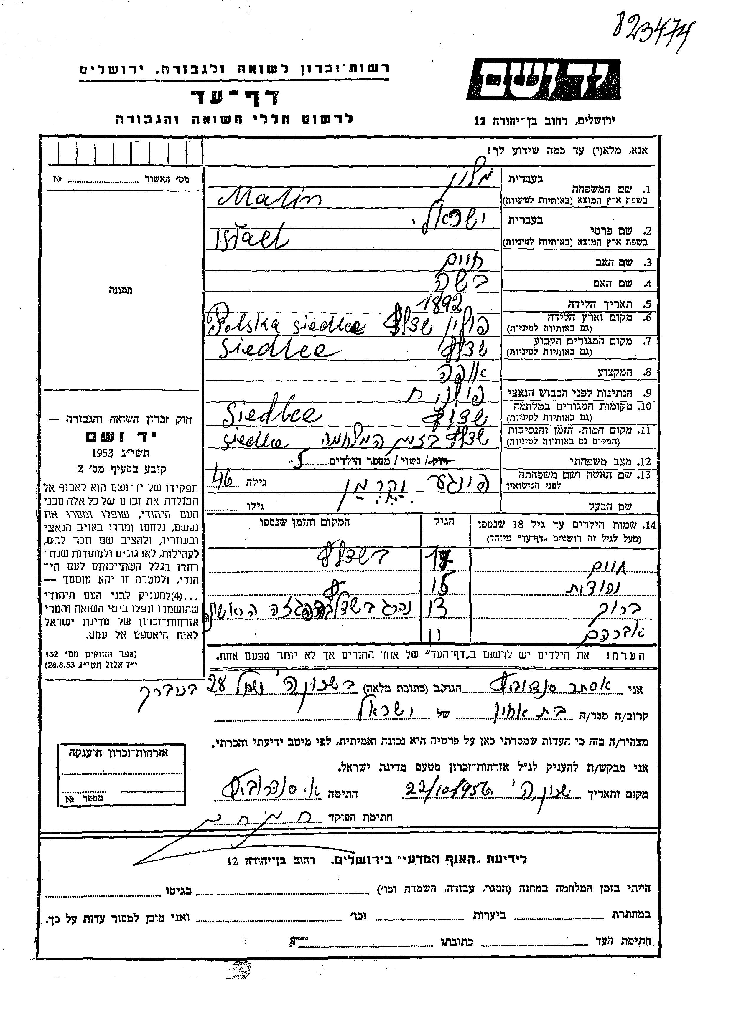 Malin Melon Barukh Siedlce, Polen Gedenkblatt