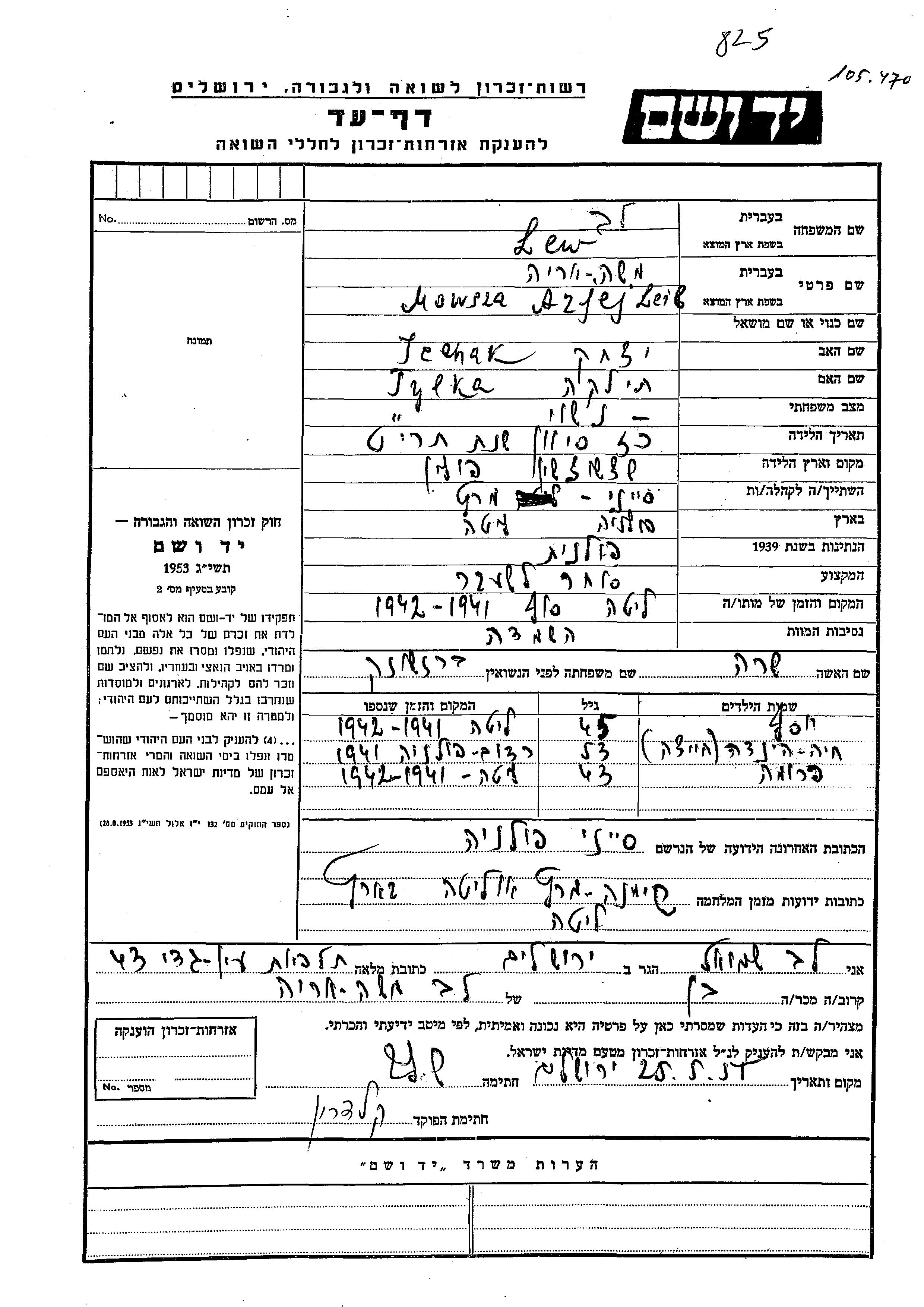 Fruma Lew wurde Er/sie war der/ die Sohn/Tochter von Mowsza Arjej Leib und Sara. Vor dem Zweiten Weltkrieg er/sie in Sejny, Polen. Während des Krieges war er/sie in Simno, Litauen.