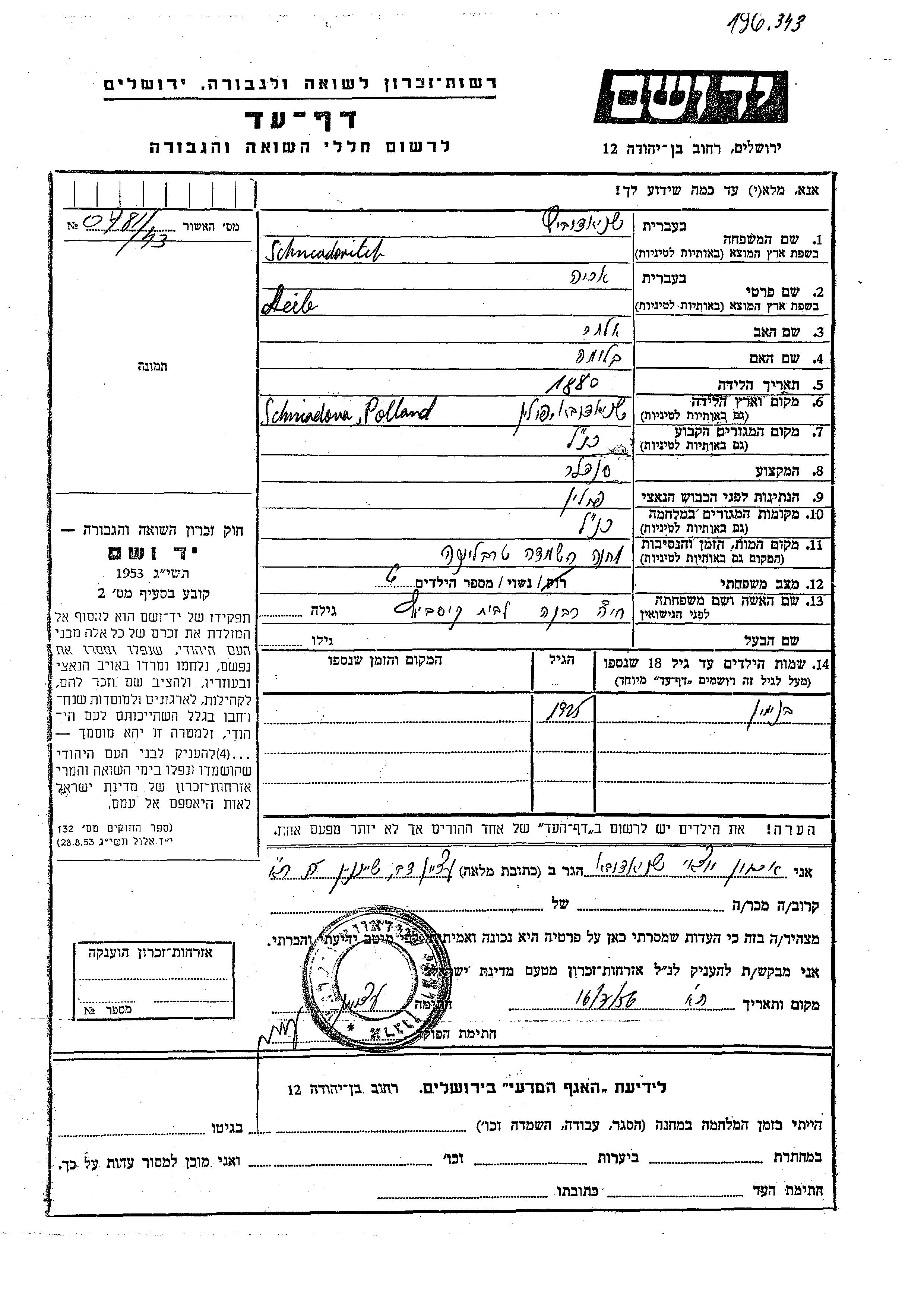 Beniamin Shniadovitz wurde im Jahr 1925 geboren. Er war der Sohn von Leib Arie und Khaia Rivka, geb. Kosevich. Er war Kind. Vor dem Zweiten Weltkrieg lebte er in Schniadova, Polen. Während des Krieges war er in Schniadova, Polen.