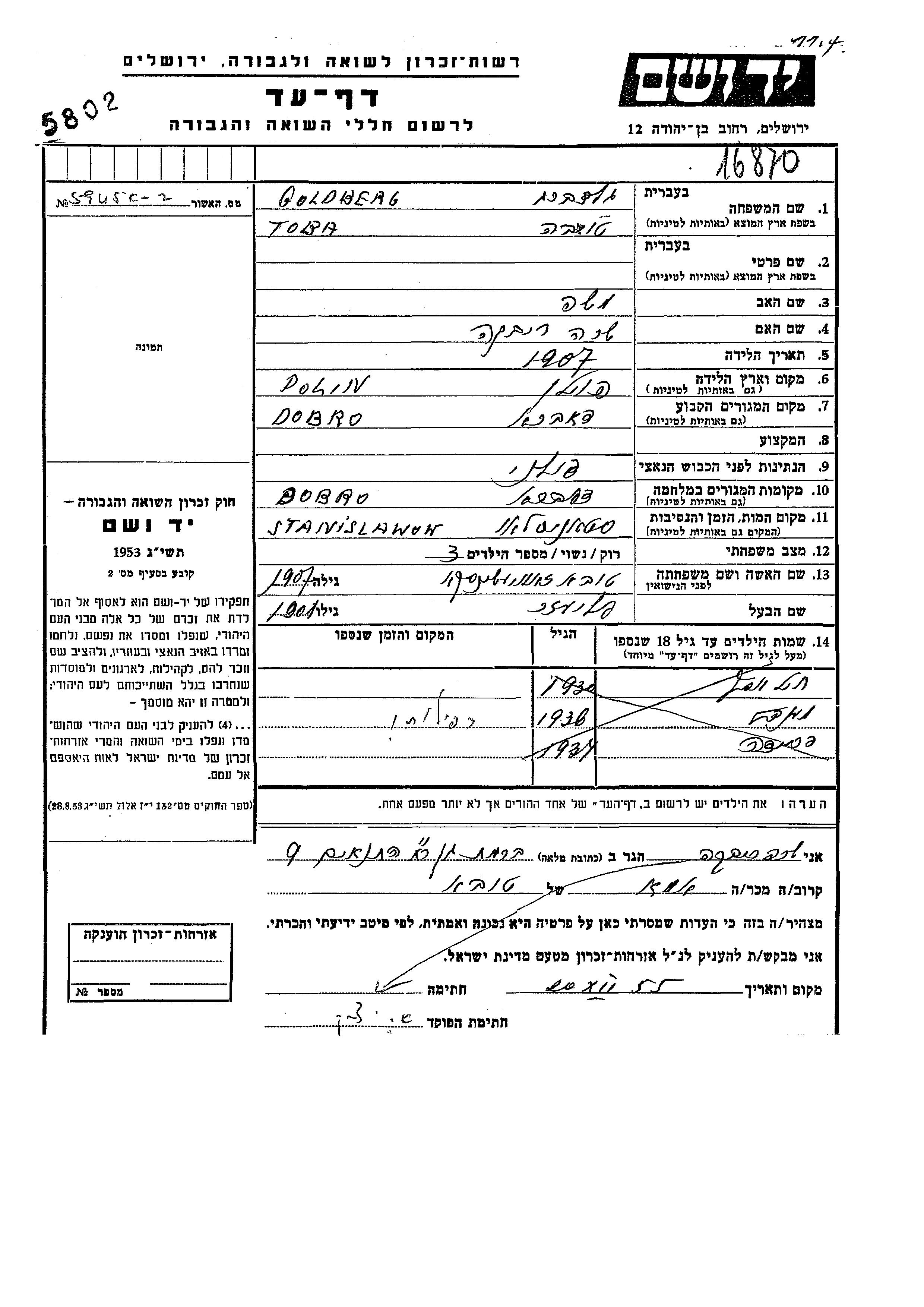 Mindl Goldberg Geldberg wurde im Jahr 1936 geboren. Er/sie war der/ die Sohn/Tochter von Eliezer und Toba Tova, geb. Zaleshinski. Er/Sie war Kind. Vor dem Zweiten Weltkrieg er/sie in Dobro, Polen.